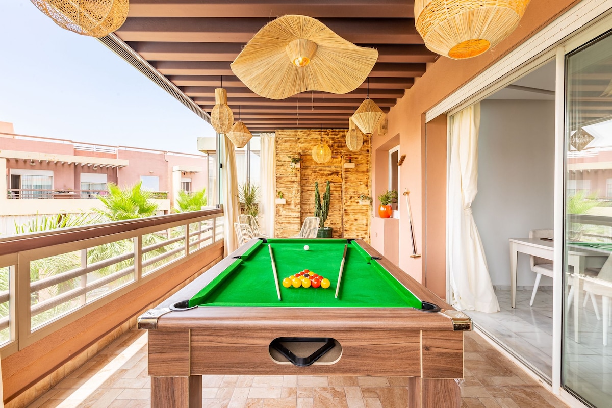 Appt 2 pièces - 52 M2 pour 4 personnes en Rez de jardin dans l'une des plus prestigieuse résidences golfiques de Marrakech. Vous serez au coeur d'un cadre de verdure avec une piscine équipée de transats ainisi que d'un bassin pour les enfants. Vous aurez a disposition un salon aménagé d'un canapé - lit avec espace TV ainsi que d'un bar de séparation avec sa cuisine entièrement aménagée et équipée, une chambre avec un lit double 140, WC, un coin repas ext, un barbecue, Wifi..