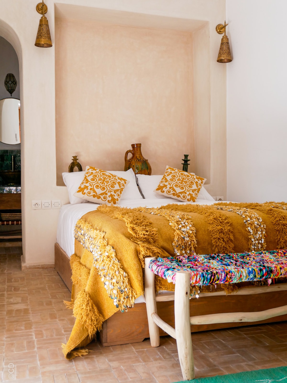 The Chebakia House is an exclusive one-bedroom house distributed across two floors and two large terraces, around the corner from the Dar El Bacha Palace. She is the little sister project to the popular Riad Chebakia. They share a whimsical pop-art aesthetic with a traditional Moroccan twist, but Apartment Chebakia is the lighter, dreamier version. She comes with two large terraces, high-end amenities, and is nestled into a delightful neighborhood 10 minutes walking from Jma el Fna.
