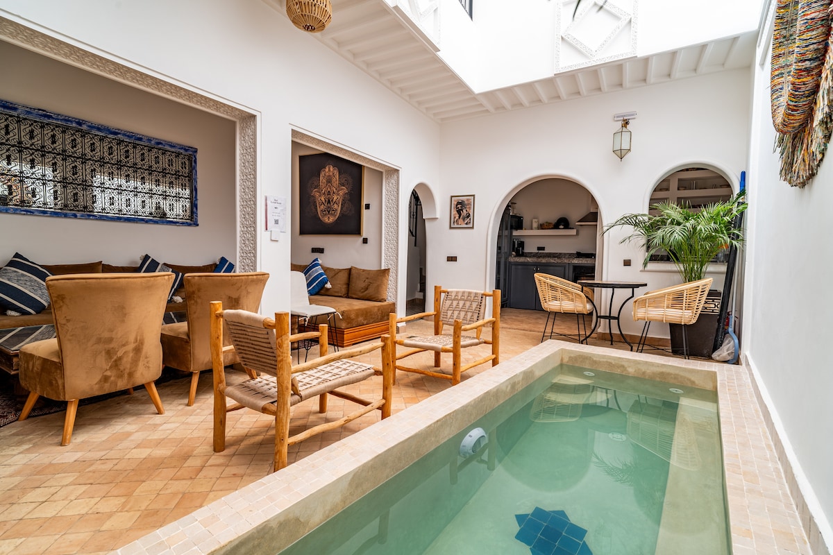 Notre Riad est une promesse d'évasion. Imaginez vos matinées bercées par le chant des oiseaux dans le patio et vos soirées sur la terrasse surplombant la ville rouge. Un mélange raffiné de zelliges traditionnels et de confort contemporain. Un salon de lecture pour s'évader, des chambres élégantes pour se ressourcer. Un patio rafraîchissant, pour le café du matin et un rooftop pour savourer le coucher du soleil. Hospitalité marocaine et confort absolu : votre parenthèse enchantée commence ici.