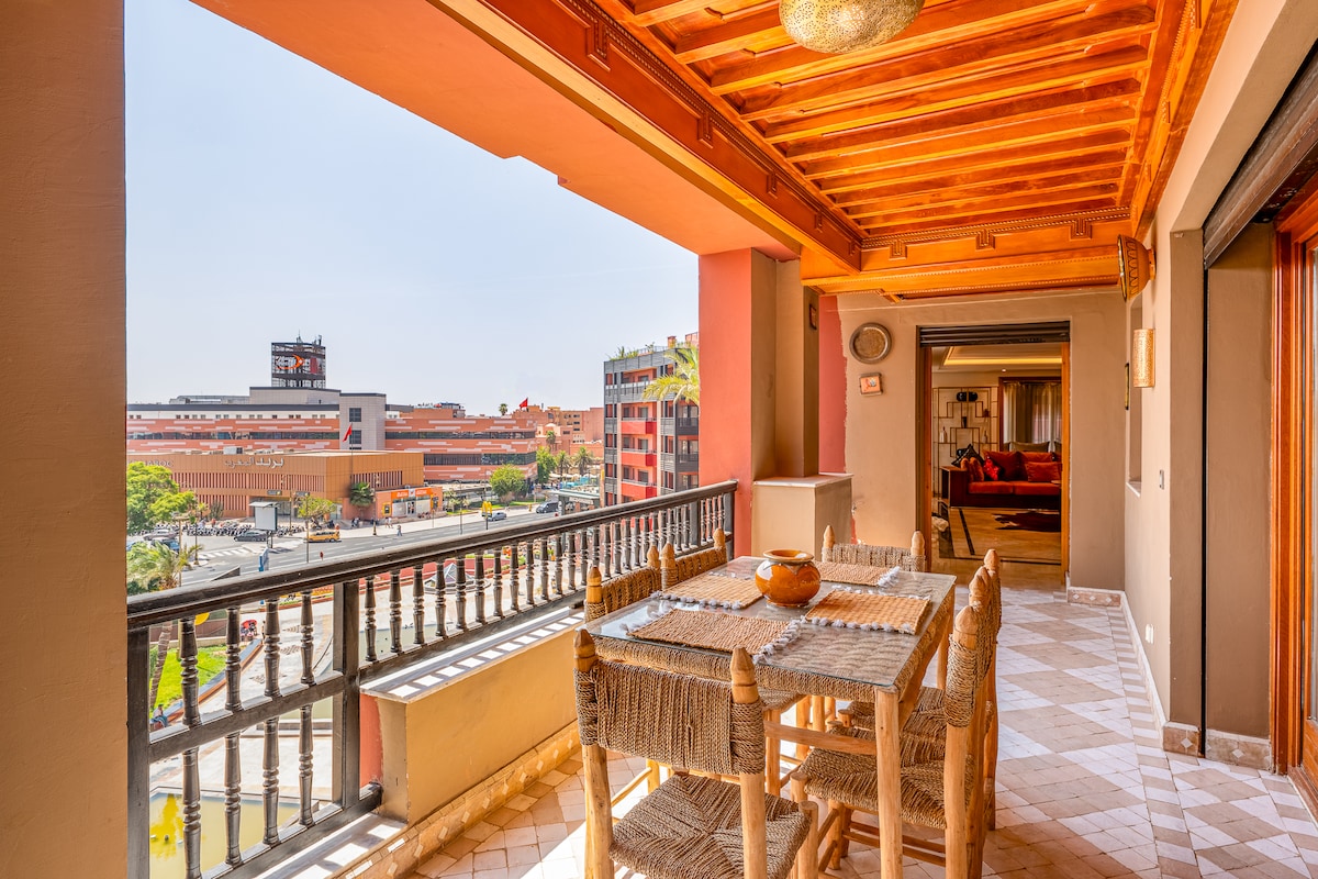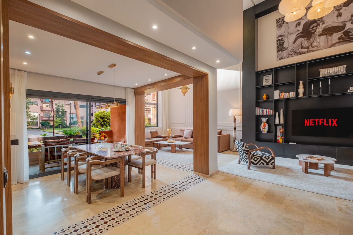Expérience immersive dans un appartement-galerie contemporaine. Parfaitement situé dans le Triangle d’Or festif, 15 min à pied de la médina. Cet appartement très haut de gamme de 140m2 lumineux et cosy. À deux pas des palaces emblématiques (Mamounia, Sofitel, Casino) Résidence de prestige avec piscine. Idéal jusqu'a 5 voyageurs, il offre 2 chambres, 3 terrasses, 2 salles de bain et 3 WC. Entre ambiance branchée et animée, une expérience unique au cœur de Marrakech vous attend.