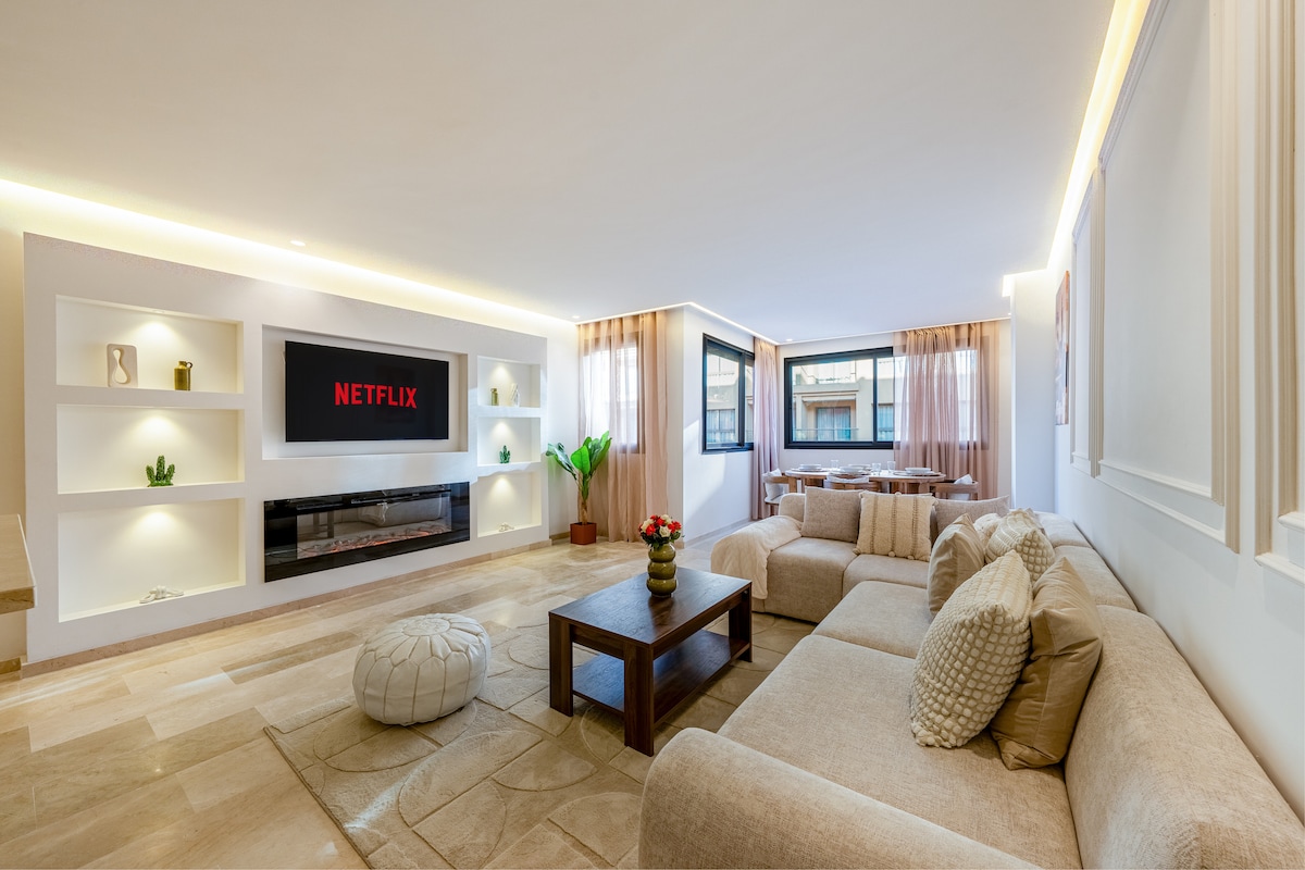 Séjournez en plein cœur de Marrakech dans notre appartement 2 chambres et 2 salles de bain. Profitez d'Une literie Simmons haut de gamme, WiFi haut débit (fibre optique) et d'une décoration moderne avec un bassin privé. Cuisine entièrement équipée, baignoire élégante, et douche italienne. À quelques pas de la place Jemaa el-Fna, du Plazza, et du Carré Eden. La piscine n’est pas chauffée. NB: Les couples marocains non mariés ne sont pas autorisés.