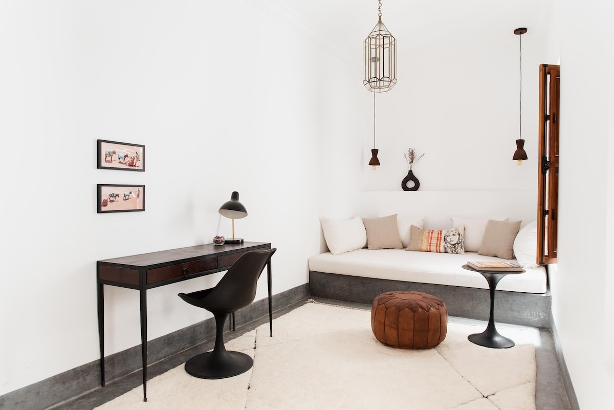 Welcome to Riad Sahara, our Marrakchi cocoon at the bottom of a very silent Derb in one of the oldest districts of the Medina called Mouassine. An authentic and renovated Riad/Douiria (small house) in a unique blend between restoration of wooden and plaster moldings and Nordic modernity ! Unique place to discover the daily life of the city 5 minutes from Jemaa el Fna Square. 3mn from The Jardin Secret or 10 from the Palace Dar el Bacha. Very safe area day & night.