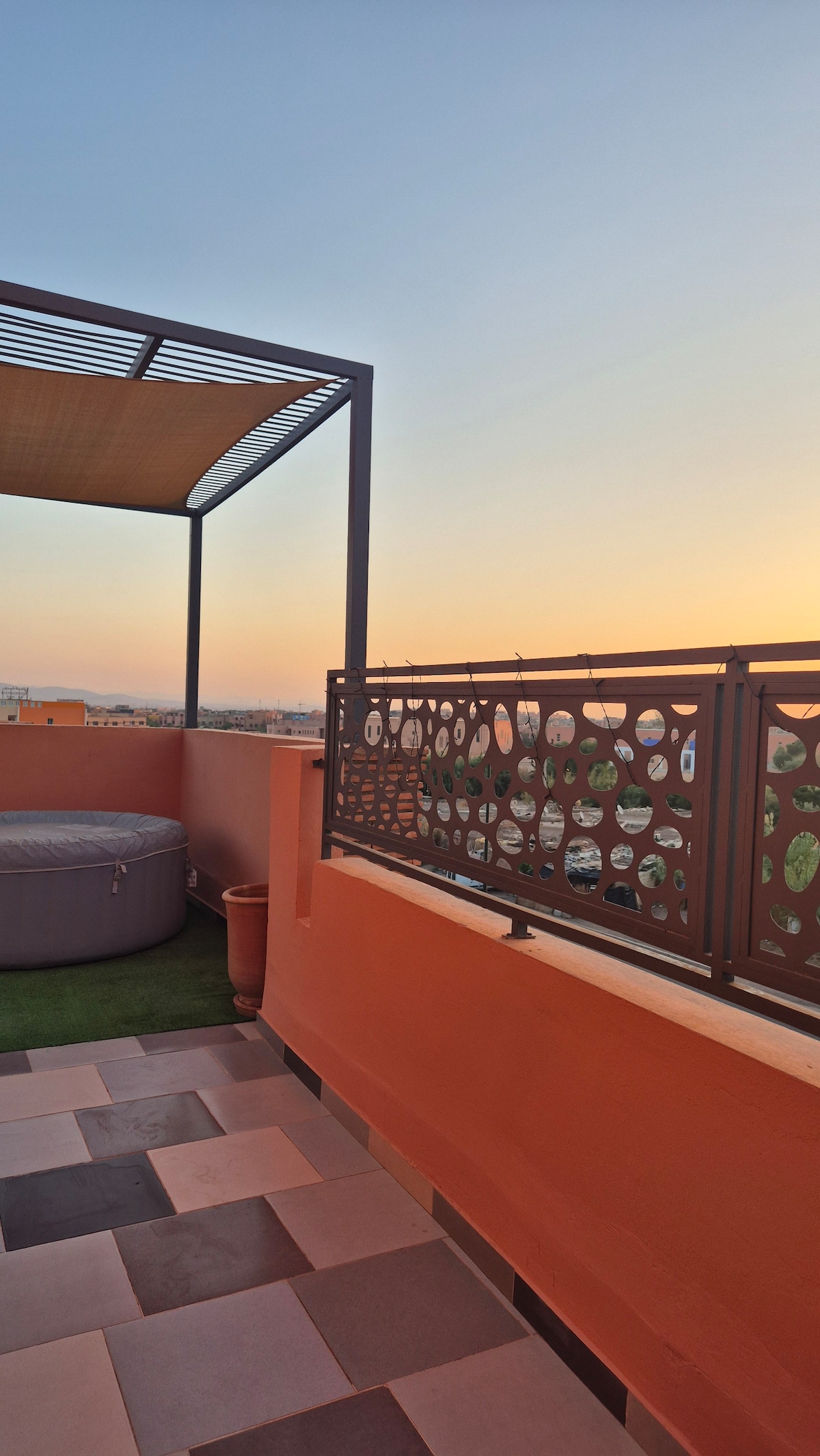 Bienvenue dans votre oasis privée au cœur de Marrakech un studio à l’inspiration tropicale, conçu autour d’un concept pur et apaisant. Ici, chaque détail invite à la détente, entre nature, lumière et confort moderne •le petit bassin privé en plein air pour un moment de bien-être • Douche extérieure rafraîchissante, ambiance naturelle • Terrasse tropicale idéale pour se détendre ou partager un repas • Décoration soignée aux tons naturels et matériaux.