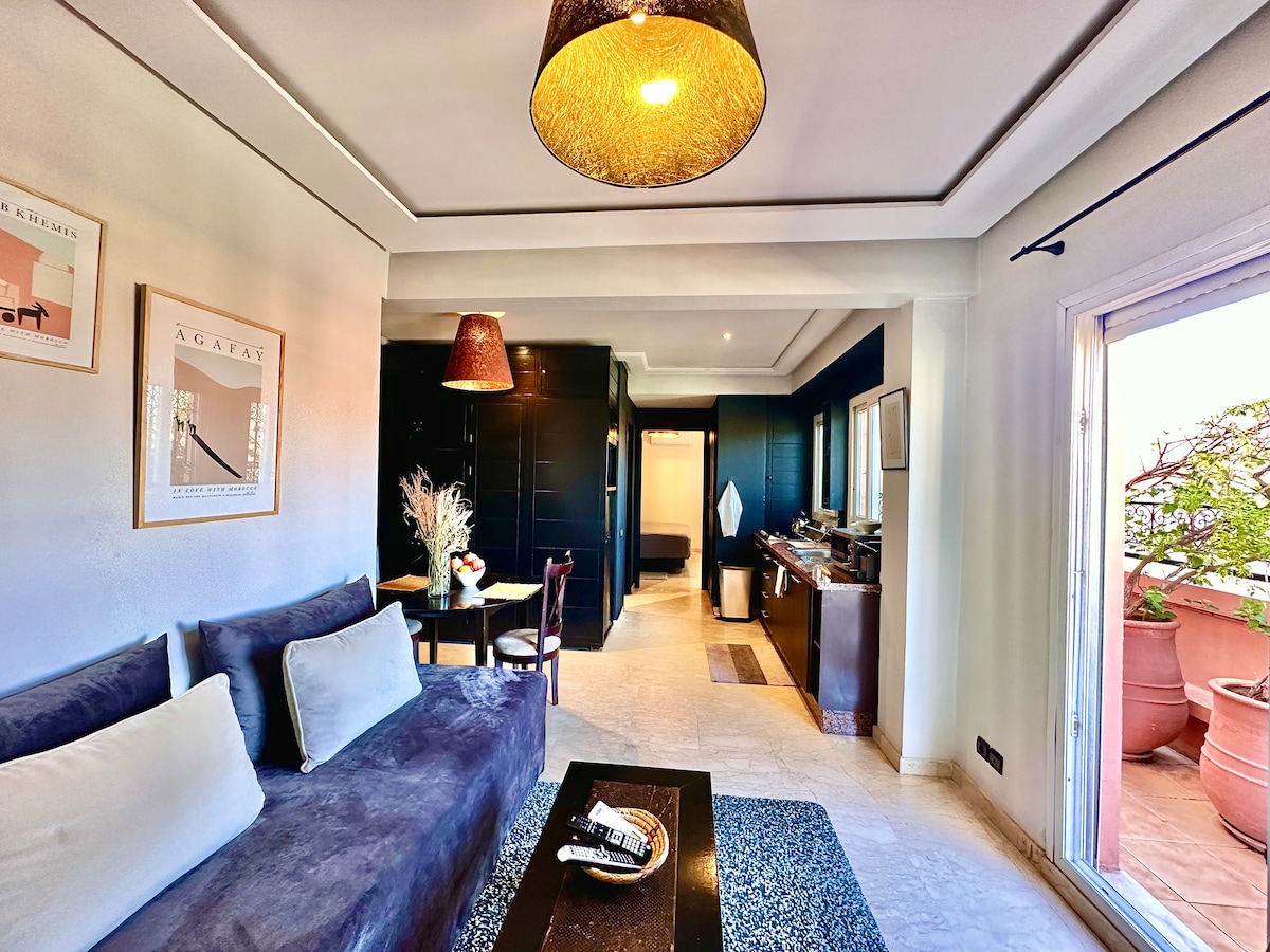 Découvrez cet élégant appartement en plein cœur de Gueliz ! Profitez d’un espace avec cuisine américaine, salle à manger, salon et chambre cosy. La grande terrasse au 4ème étage, accessible depuis le salon et la chambre, est idéale pour vos moments de détente. Situé au centre de l’animation, à quelques pas de Plazza, Carré Eden, Café de la Poste, jardin du Harti, et de la gare, vous êtes parfaitement placé pour explorer Marrakech. Un parking sécurisé est disponible au sous-sol de la résidence.
