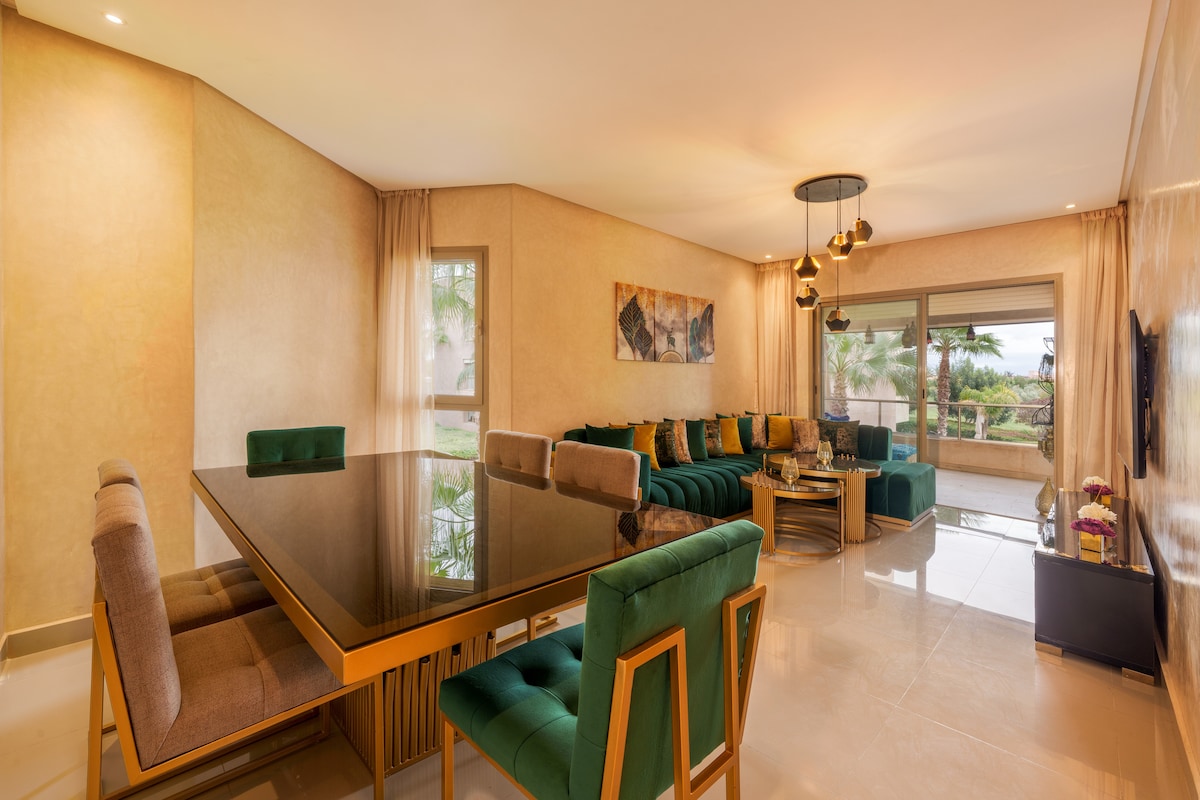 Welcome to a luxurious apartment located in Prestigia Marrakech – Saphir, offering a bright open-concept living space with large windows and beautiful views over the golf course and landscaped gardens. This elegant apartment combines comfort and tranquility in a secure residence, just 5 minutes from Marrakech Airport, 7 minutes from Menara Mall, and 12 minutes from Jemaa el-Fnaa, providing easy access to the city while remaining peaceful.