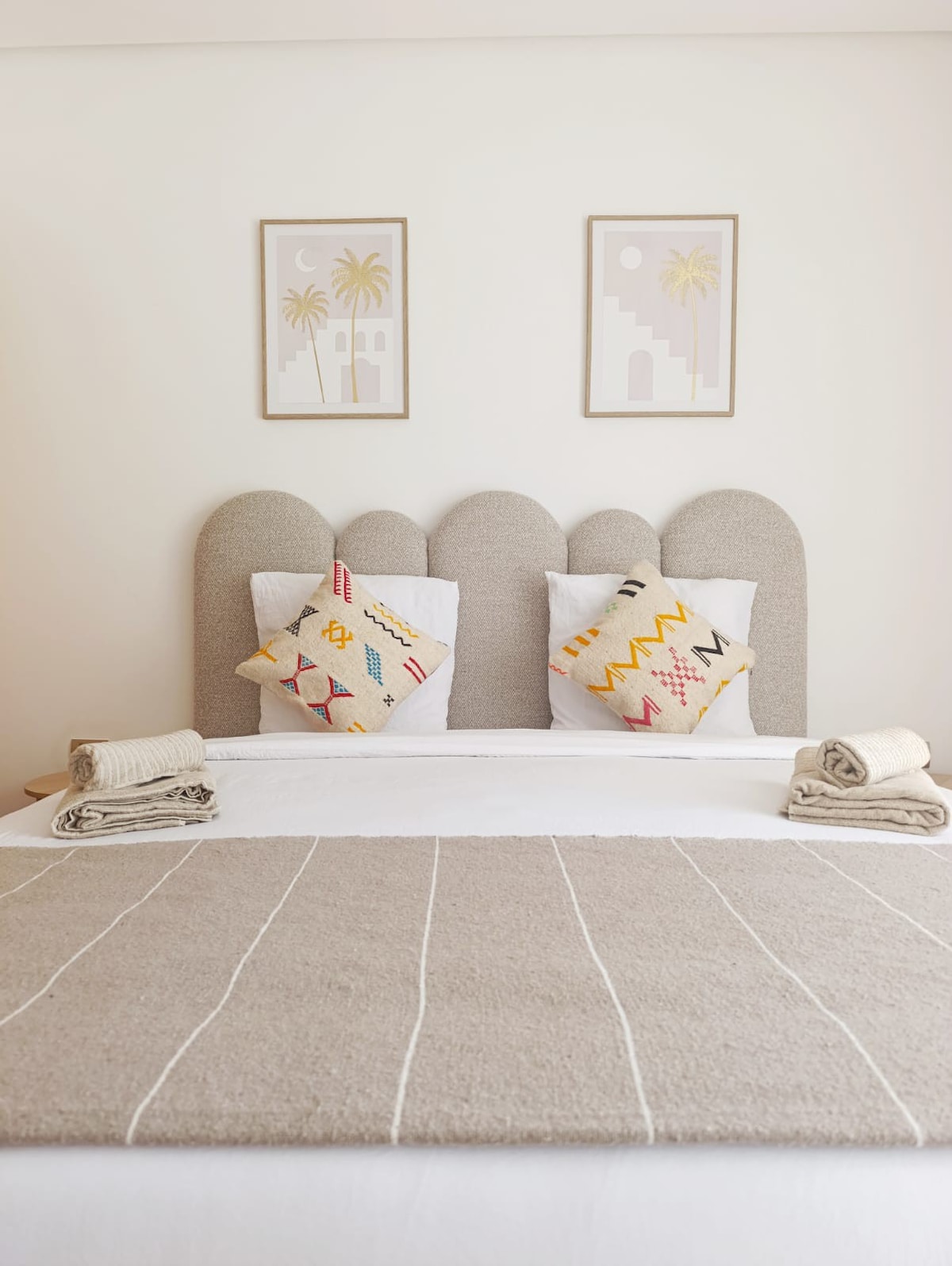 Bienvenue à Palm Nest, un appartement lumineux et paisible niché au cœur de la Palmeraie, à seulement 8 km de la Médina. Vous profiterez d’un cadre calme, entouré de palmiers et d’oliviers, avec 3 terrasses privées, dont deux offrant une belle vue sur le lac et les jardins. Entre un réveil en douceur sur vos terrasses, des moments de détente dans la résidence et des promenades dans les jardins, tout est pensé pour votre bien-être et votre confort, sans artifice.