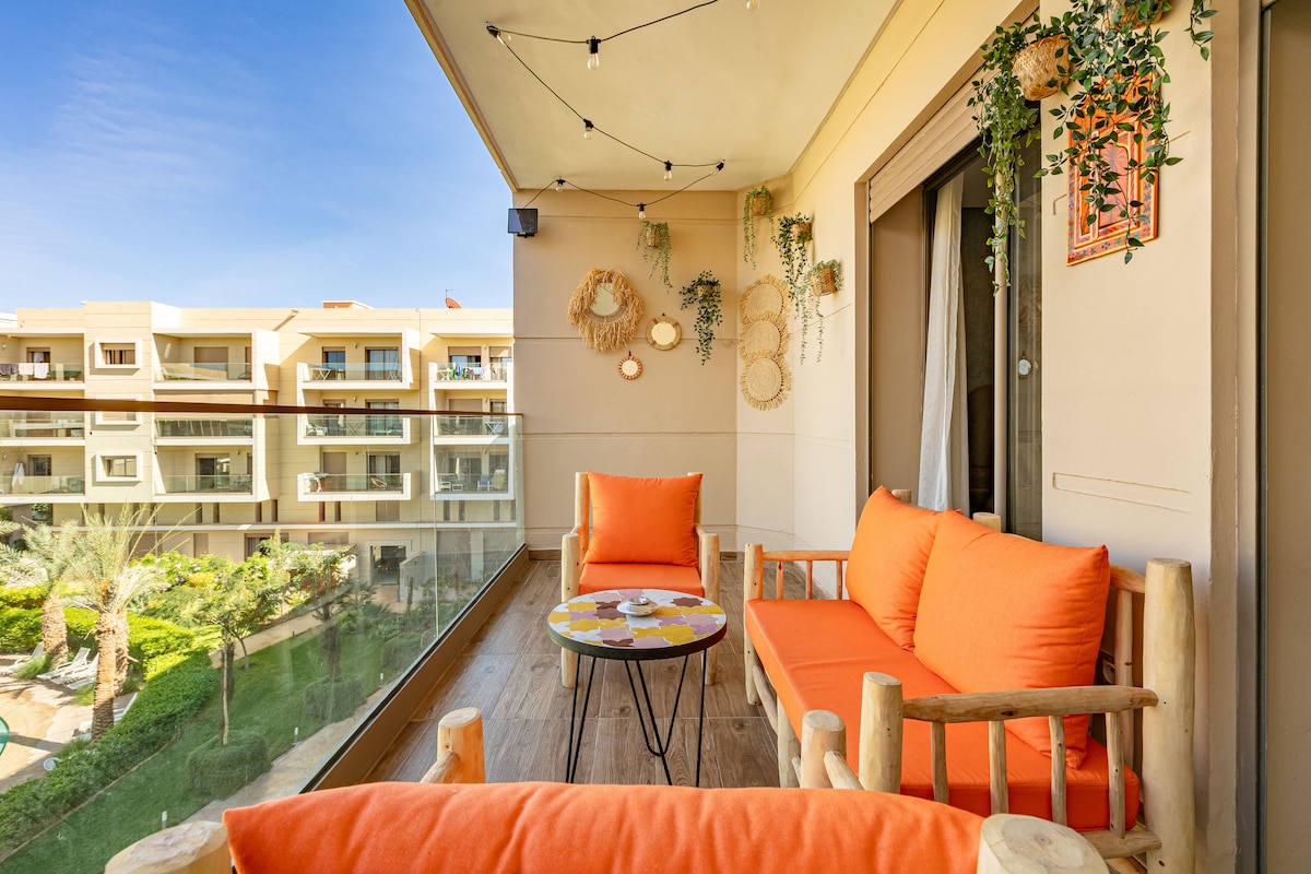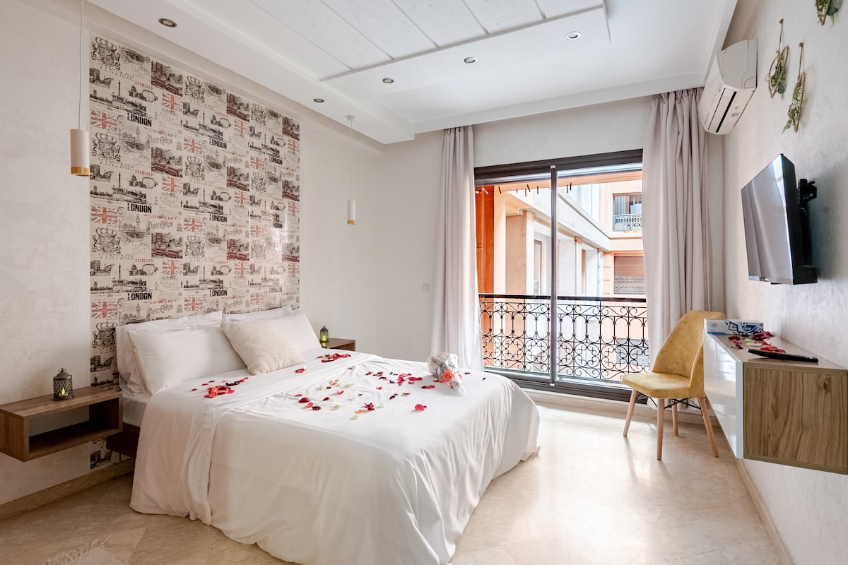 Séjournez en plein cœur de Marrakech dans notre appartement 2 chambres et 2 salles de bain. Profitez d'Une literie Simmons haut de gamme, WiFi haut débit (fibre optique) et d'une décoration moderne avec un bassin privé. Cuisine entièrement équipée, baignoire élégante, et douche italienne. À quelques pas de la place Jemaa el-Fna, du Plazza, et du Carré Eden. La piscine n’est pas chauffée. NB: Les couples marocains non mariés ne sont pas autorisés.