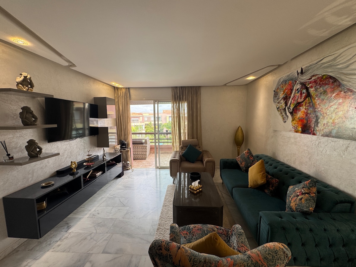 Bienvenue aux Perles de Marrakech, où le luxe rencontre la sérénité! Plongez dans l'élégance de notre appartement deux chambres, à seulement 7 minutes de la vibrante place Jemaa el-Fna. Détendez-vous dans un salon oriental, savourez une cuisine équipée, et admirez la Koutoubia depuis votre terrasse. Profitez de la piscine toute l'année et explorez les trésors à proximité tels que le palais Bahia. Idéalement situé, à 10 minutes du centre des congrès de Gueliz et à 6 km de l'aéroport.