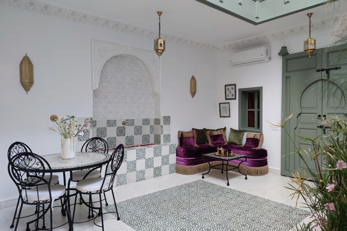 Notre Riad est une promesse d'évasion. Imaginez vos matinées bercées par le chant des oiseaux dans le patio et vos soirées sur la terrasse surplombant la ville rouge. Un mélange raffiné de zelliges traditionnels et de confort contemporain. Un salon de lecture pour s'évader, des chambres élégantes pour se ressourcer. Un patio rafraîchissant, pour le café du matin et un rooftop pour savourer le coucher du soleil. Hospitalité marocaine et confort absolu : votre parenthèse enchantée commence ici.