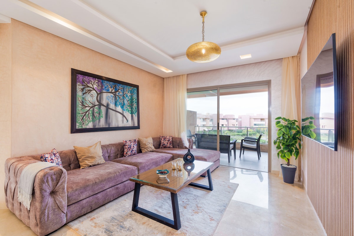Beautifull spacious and bright apartment in the heart of a quiet and upscale residence in Marrakech Golf City with swimming pool and golf course nearby. The accommodation guarantees you the luxury touch of your stay in Marrakech. The apartment is located 5 minutes from Marrakech Menara airport. The Menara Mall and Almazar shopping center is 5min away as well as the Menara Garden. LA Koutoubia and JAMAA EL FNA square is located 10 minutes from the apartment. Excellent stay!!