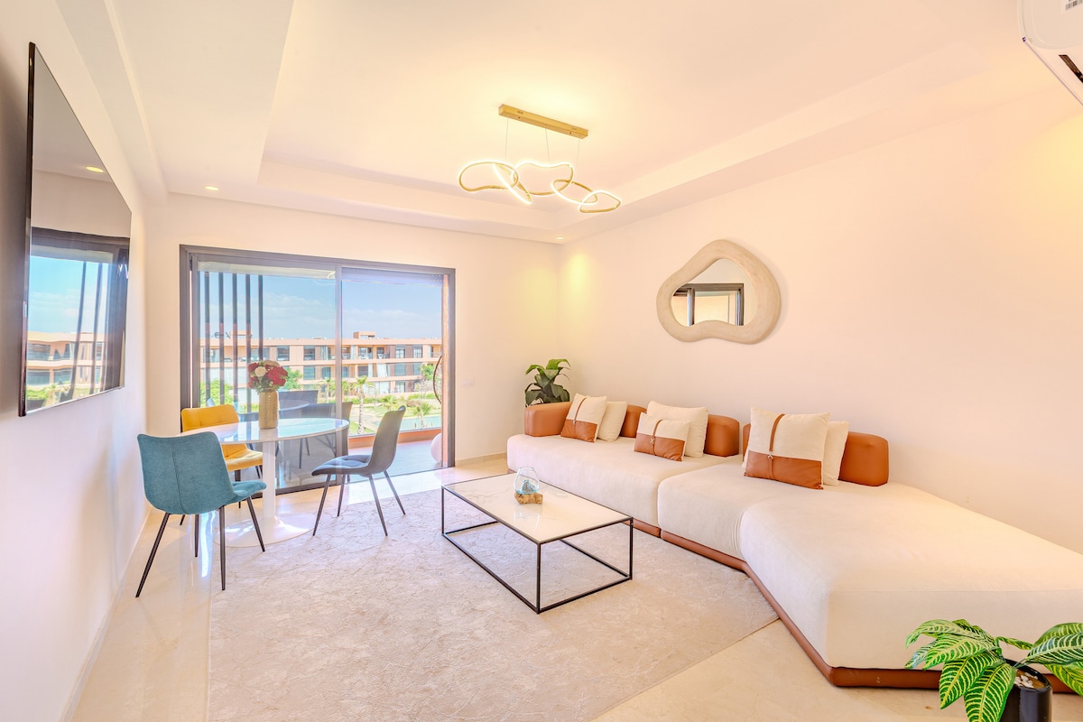 Welcome to HM-0041 at HouseMe, a two-bedroom apartment designed for family luxury. Every detail is tailored for optimal comfort. The spacious, light-filled bedrooms create a tranquil haven. The living area, both modern and warm, is the perfect spot for family relaxation. The contemporary, fully-equipped kitchen invites culinary delights. Also, enjoy the residential pool for refreshing moments under the Moroccan sun. This apartment is your luxurious oasis in Marrakech.