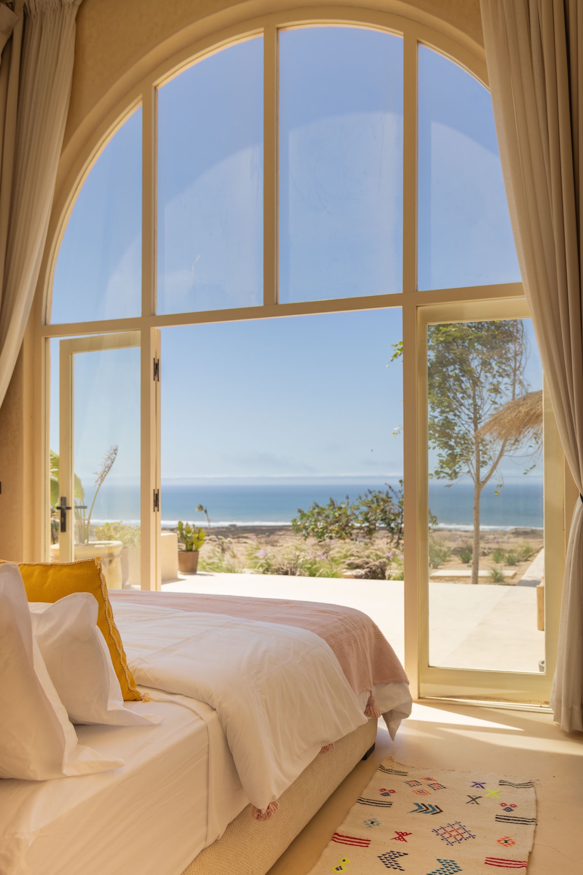 This newly opened apartment in the ancient medina offers stunning ocean views and a spacious 30㎡ sunny room, inviting you to relax with the peaceful energy of ocean. On the ground floor, you’ll find a vibrant music session room where local and traveling musicians gather to play — an ideal spot for music and culture lovers. We speak English,French,Arabic,Japanese 1-minute walk from the historic city wall and 6-minute to the main square where the Gnaoua Festival’s stage comes alive.