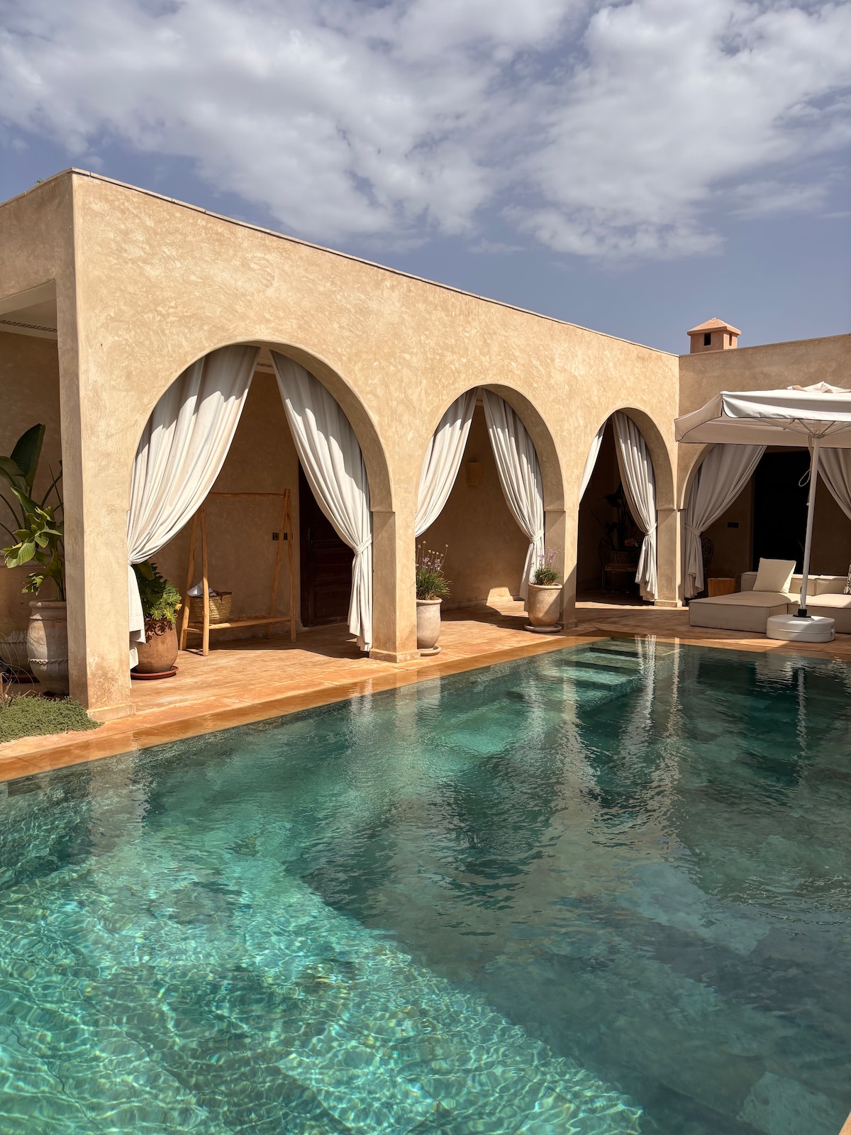 Bienvenue dans votre oasis privée au cœur de Marrakech un studio à l’inspiration tropicale, conçu autour d’un concept pur et apaisant. Ici, chaque détail invite à la détente, entre nature, lumière et confort moderne •le petit bassin privé en plein air pour un moment de bien-être • Douche extérieure rafraîchissante, ambiance naturelle • Terrasse tropicale idéale pour se détendre ou partager un repas • Décoration soignée aux tons naturels et matériaux.