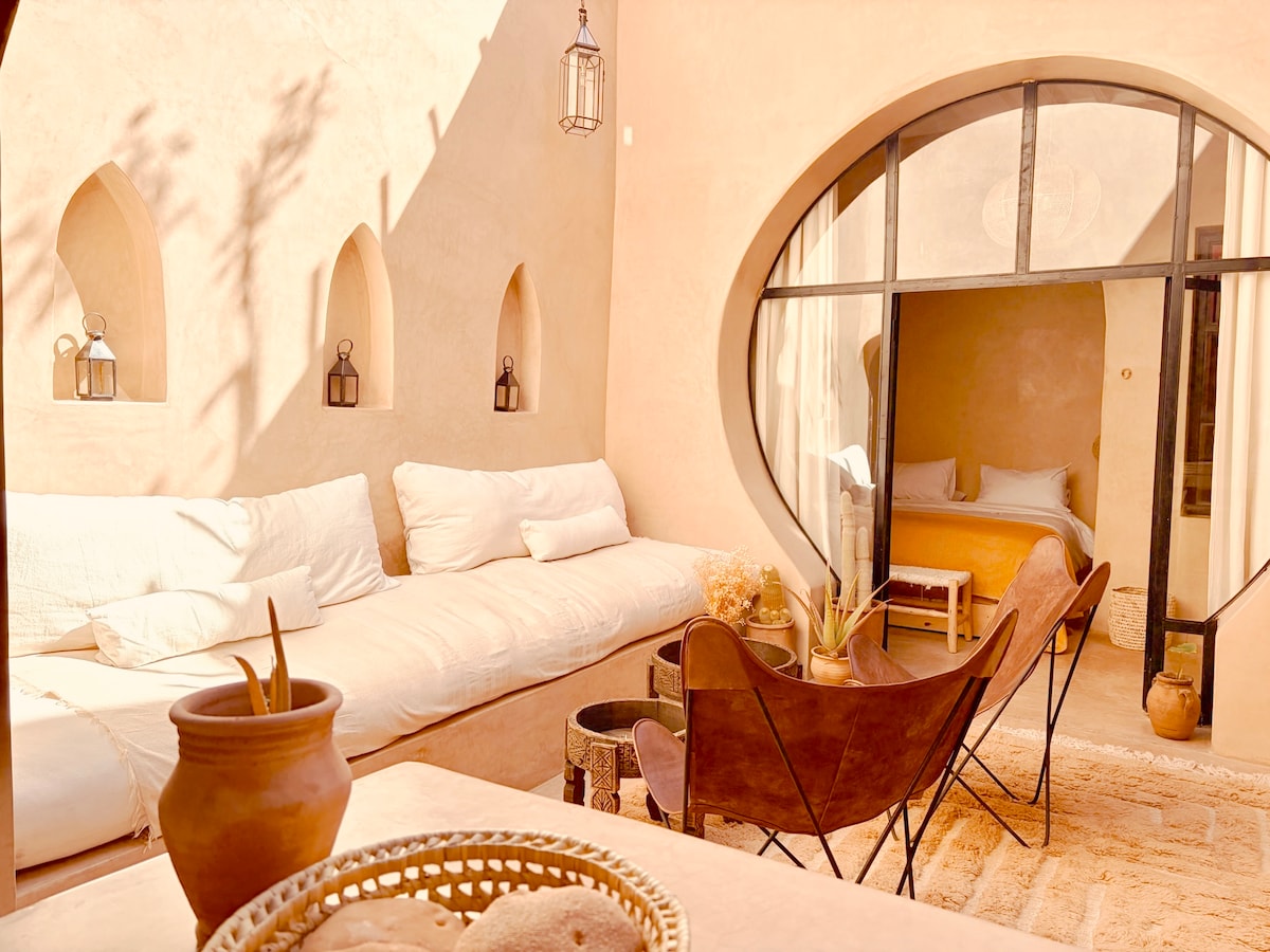 Ce joli petit Riad restauré avec goût est situé dans une ruelle calme et authentique de l'ancienne médina. Le raid s'articule autour d'un confortable salon central et lumineux, très bien équipé et meublé avec soin, il offre un endroit typique et conviviale. C'est un véritable havre de paix à venir découvrir seul ou en famille, où vous pourrez profitez une vue panoramique sur la médina et ses toits. Une équipe sera à votre écoute et aux petits soins pour vous aider à être comme à la maison