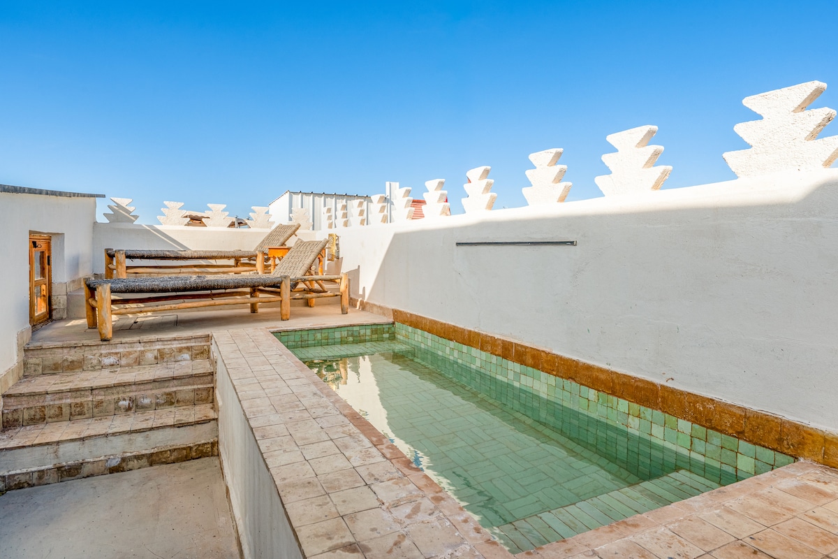 Charming Riad in the Old Medina** Experience authentic Moroccan hospitality near Dar El Pacha. Our beautifully designed riad blends modern elegance with traditional style, featuring three serene suites with cozy beds. Enjoy a complimentary daily breakfast and cleaning services. Unwind in the inviting small swimming pool or relax in our outdoor seating area. Explore vibrant local markets and cultural sights—all from our perfect location. Your unforgettable Moroccan getaway awaits!