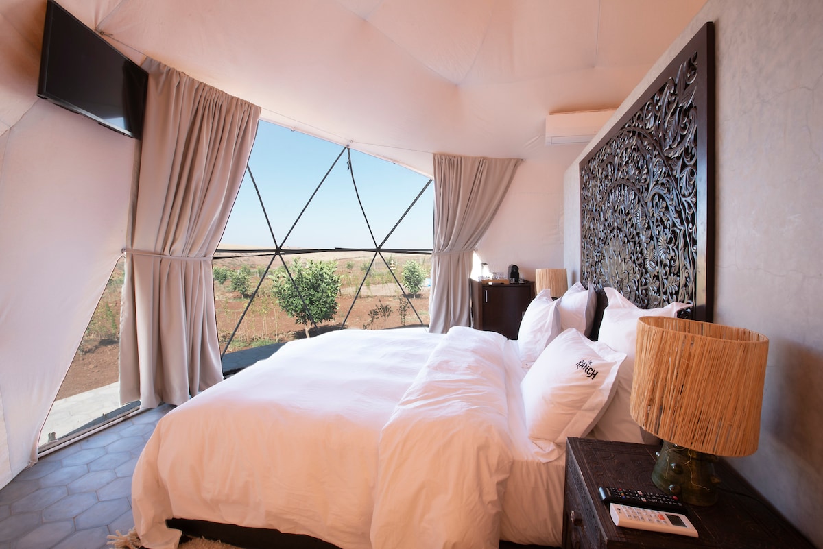 Stay in our dome at The Ranch Resort, a unique nature escape in the Marrakech region, ideally located between Marrakech and the Agafay desert. The dome features a king-size bed, private modern bathroom, and stunning Atlas Mountain views. Enjoy pools, restaurants, gardens, and the animal park, then relax under a starry sky. An ideal getaway for couples seeking comfort and tranquility near Marrakech.
