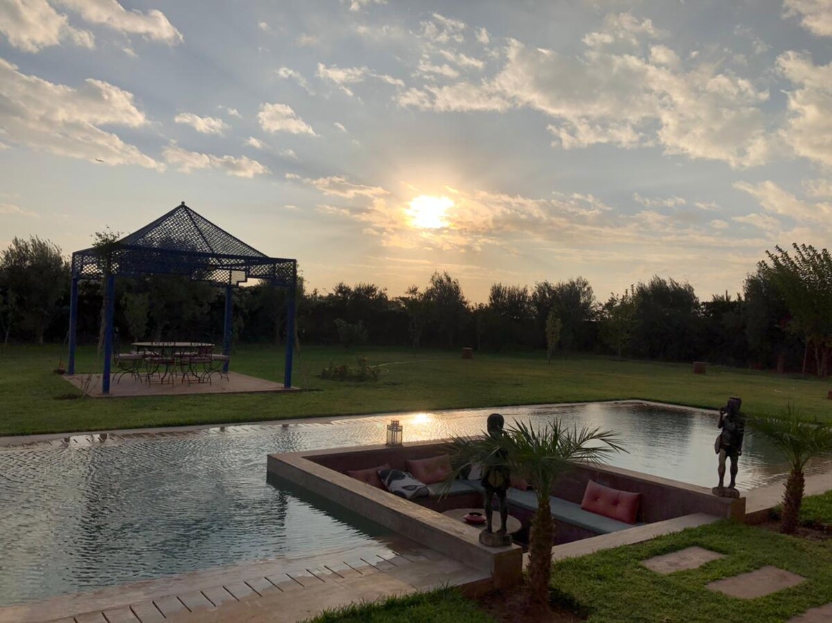 Beautiful villa with character 15/20 minutes driving from the Medina and the center. Big garden, swimming pool and house completely privative with possibility of yoga, class, massage indoor and outdoor in our garden spa Price for lunch per person including bfast or diner 25 euros The staff is discreet and attentive cleaning everyday included. Adapted to the smallest with all necessary equipment We can organiseday spa, tour guide in Marrakech and around for a day or half-day.
