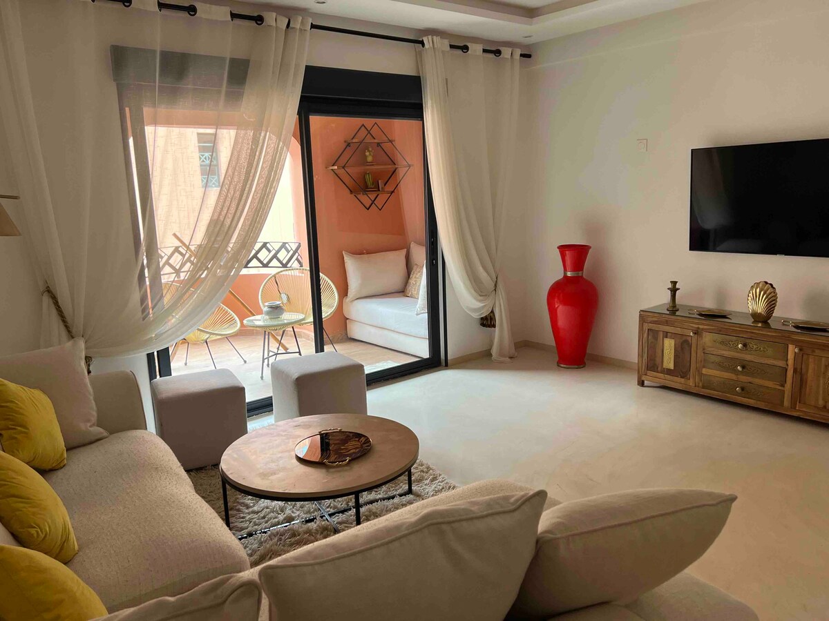 Welcome to our thoughtfully designed 1 bedroom apartment with Jaccuzi, where positive energy flows through every inch. in the center of Gueliz 10 min walk from carré Eden and the 5 minutes from the train station. Perfectly situated, you'll be surrounded by an array of restaurants, cafes, and shops. Well Equipped, we've taken care of every detail, high-speed internet, IP TV, Netflix, ensuring a seamless experience and make your stay stress-free