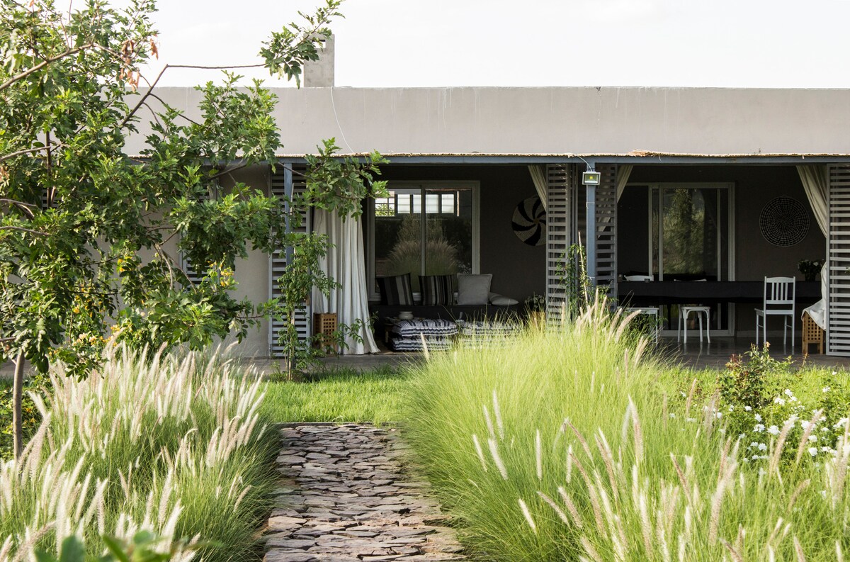 Maison d'architecte située à la campagne typique de la région de Marrakech, pour les amoureux de la nature . Jardin magnifique, légumes du potager et poulailler. Il y a une piscine privative. Le tout sur un terrain de 5000m2. Un gardien est présent dans la propriété et une pisciniste nettoie la piscine 2 fois par semaine l'hiver et tous les jours l'été. L'eau et l’électricité sont des ressources sacrées à la campagne :) Le respect de l'environnement est important.