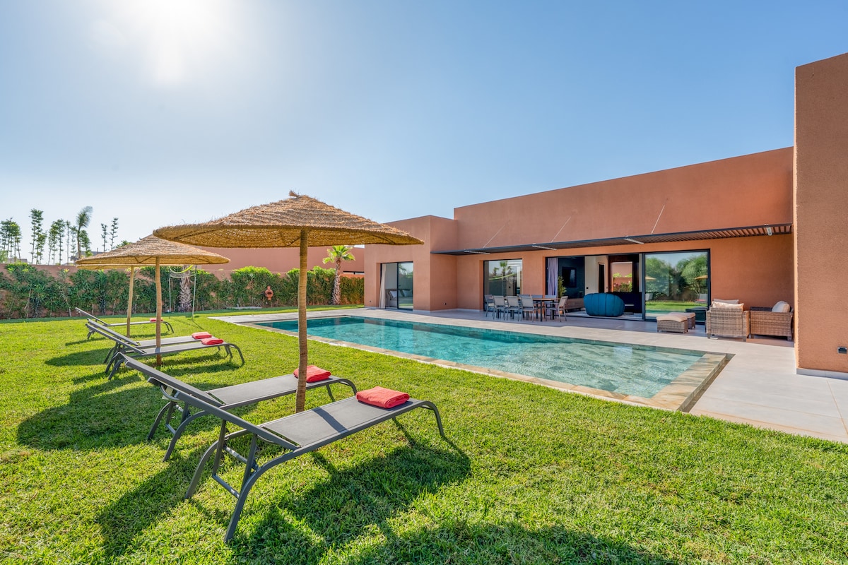 Villa située à 30 minutes de Gueliz dans un charmant domaine sécurisé 24/7 avec terrain de tennis commun et piscine privée. La villa se compose de 3 tres grandes suites avec chacune leur cheminée, leur télé (Netflix gratuit), 3 salles de bain, d'une petite piscine intérieure chauffée, d'une piscine extérieure privative et d'un jardin privatif sans vis à vis, d'un salon avec cheminée. Table à manger convertible en billard et en table de ping-pong. Idéal pour se détendre au calme.
