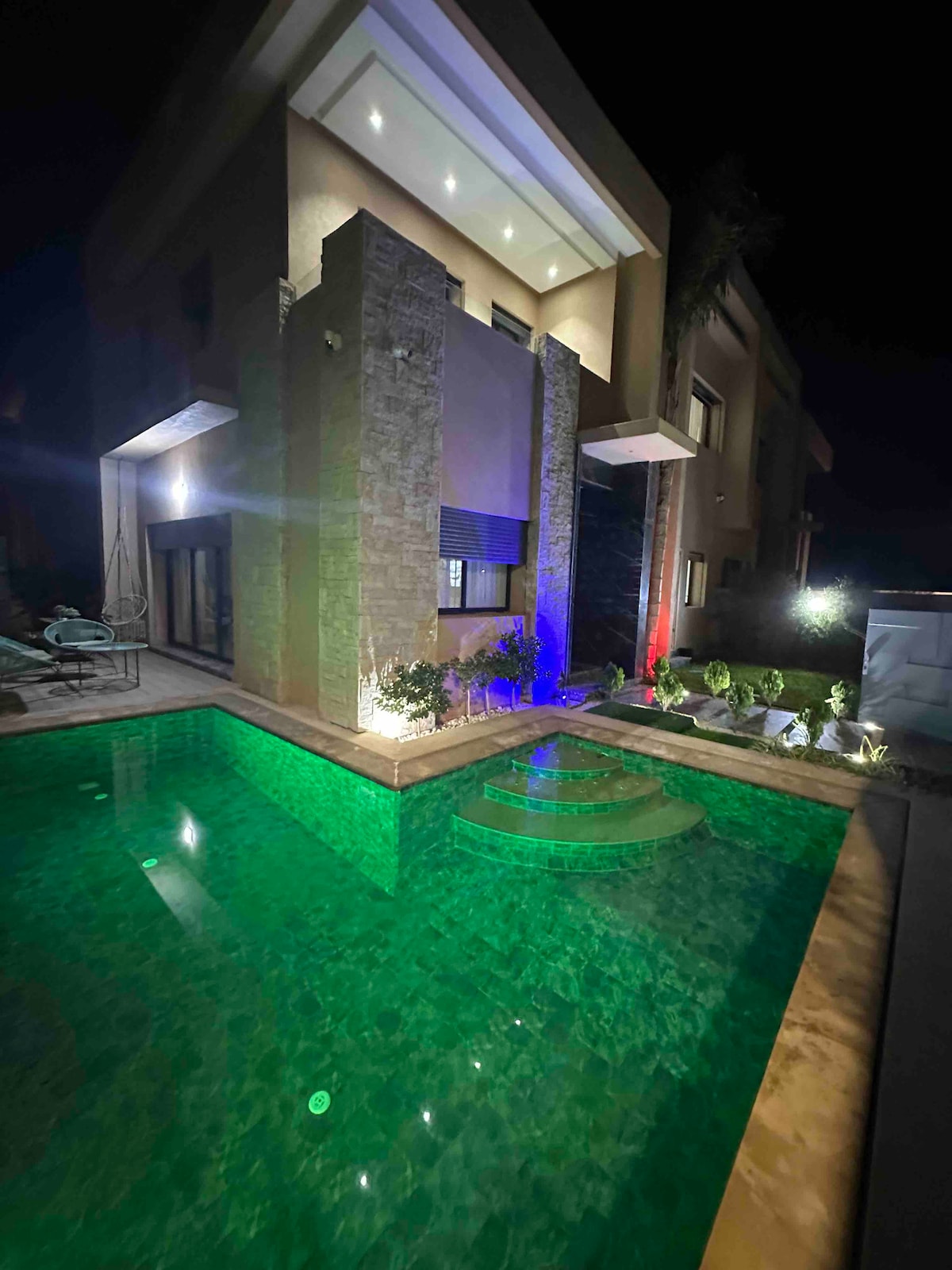 Villa située à +/- 30 minutes de Gueliz et de la médina dans un charmant domaine sécurisé 24/7 avec un terrain de tennis commun et de piscine privées. La villa se compose de 3 tres grandes suites avec chacune leur cheminée, leur télé (Netflix gratuit), 3 salles de bain, d'une petite piscine intérieure chauffée, d'une piscine extérieure privative et d'un jardin privatif sans vis à vis, d'un salon avec cheminée. Table à manger convertible en billard ou en table de ping-pong. Villa au calme.
