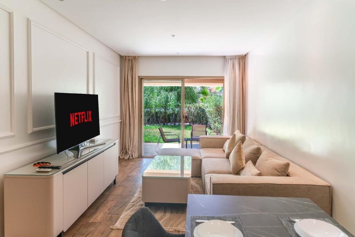 Offrez-vous un séjour d’exception dans un domaine golfique prestigieux, alliant calme et raffinement au pied de l’Atlas. Cet appartement élégant dispose d’un jardin privé et d’un accès direct à la piscine, pour des moments de détente en toute intimité. Climatisé et entièrement équipé, il vous garantit un confort optimal dans un cadre serein et luxueux. Parfait pour familles ou amis en quête de tranquillité et d’élégance. À 3 min : Aéroport À 5 min : M Avenue À 2 min : Carrefour