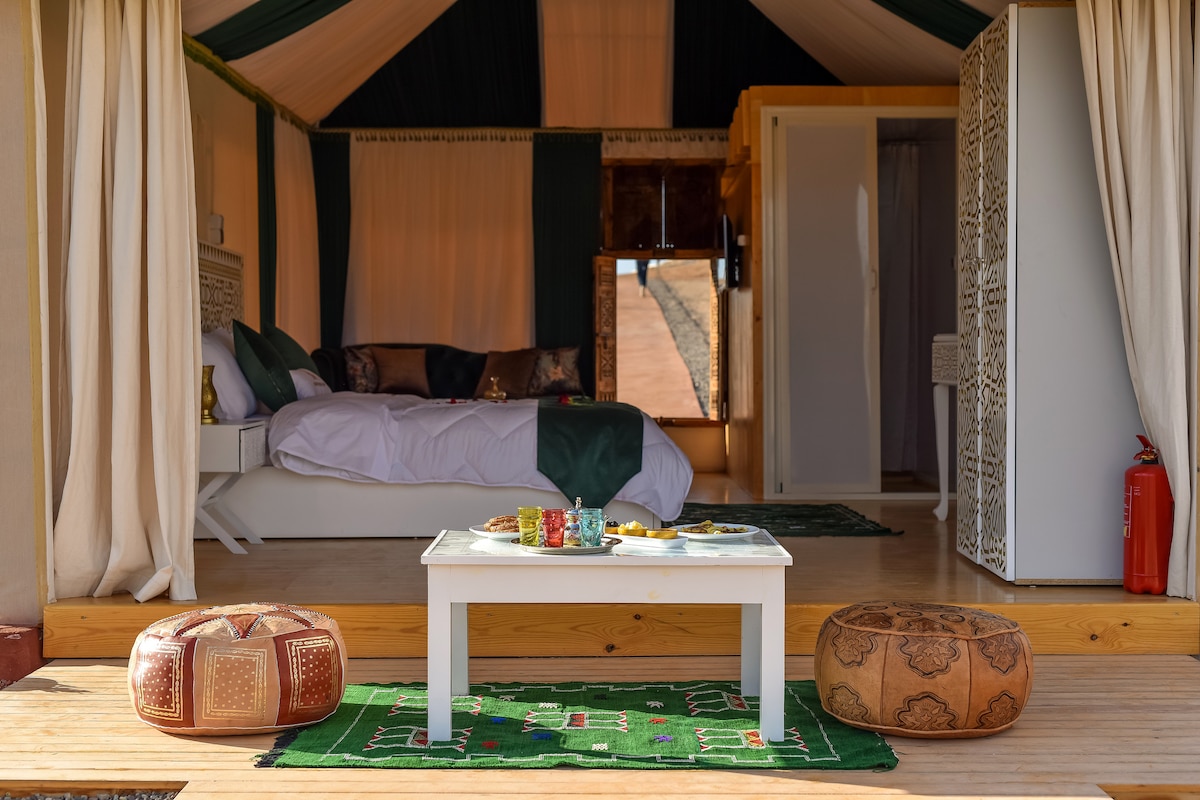 À seulement 40 minutes de Marrakech, notre camp à Agafay vous invite à vivre une parenthèse de détente et de déconnexion au cœur du désert. Niché dans un cadre naturel et paisible, le camp propose des tentes doubles vertes alliant authenticité et confort. La tente double verte est soigneusement aménagée pour offrir une expérience relaxante : literie confortable, décoration élégante inspirée du désert, espace privé et atmosphère apaisant