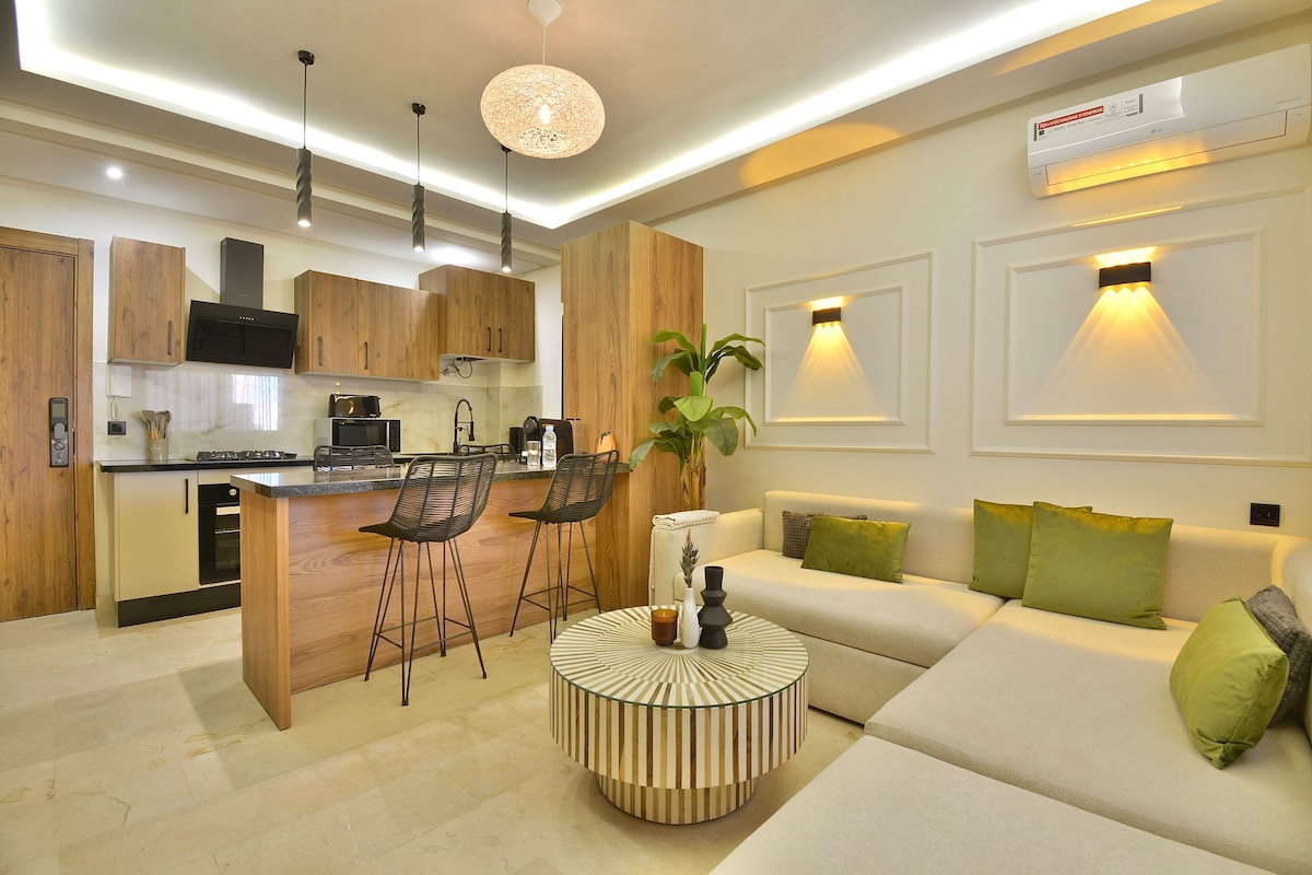 Step into a warm and authentic Moroccan-inspired suite in the heart of Marrakech. Designed with tadelakt touches, handcrafted décor, and soft earthy tones, this studio offers the perfect blend of tradition and modern luxury Highlights • Luxurious private jacuzzi for a relaxing, spa-like escape • Authentic Moroccan design with elegant artisanal details • Prime central location near Gueliz, cafés, shops, and major attractions • Comfortable bed & fast Wi-Fi • Fully equipped kitchenette