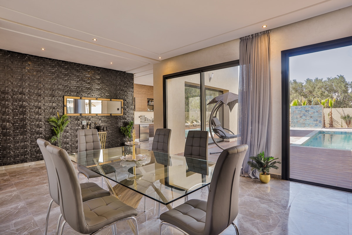 Villa située à 30 minutes de Gueliz dans un charmant domaine sécurisé 24/7 avec terrain de tennis commun et piscine privée. La villa se compose de 3 tres grandes suites avec chacune leur cheminée, leur télé (Netflix gratuit), 3 salles de bain, d'une petite piscine intérieure chauffée, d'une piscine extérieure privative et d'un jardin privatif sans vis à vis, d'un salon avec cheminée. Table à manger convertible en billard et en table de ping-pong. Idéal pour se détendre au calme.