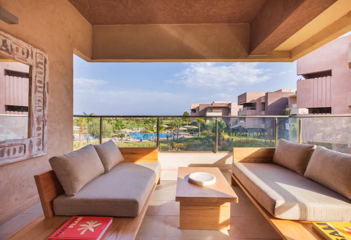 3 Bedroom stylish apartment with a swimming pool in Prestigia Golf Resort right in the city center. Niched in a perfect location, very close to the airport, and only a few minutes away from the Medina, the Mamounia and M Avenue. Enjoy large smart TV for Netflix, comfortable bedding and amazing views on the golf overlooking the Atlas Mountains. The apartment is inside a golf residence with security, a club house, swimming pools and a golf course with breathtaking views of the Atlas Mountains.