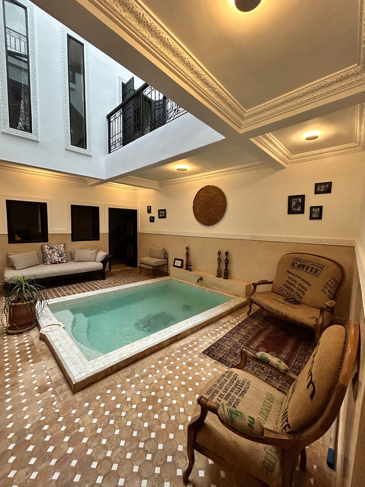 Riad Dar Num was fully renovated in 2023 in order to offer you an exceptional stay in the heart of the of Marrakech Medina. The riad offers more than 320 square meters of living space with 4 bedrooms, 5 lounge areas, 2 kitchens, 3 terraces, and a heated swimming pool. A few minutes walk from the Jeema el Fna square and. the souks entrance, it has direct car access and a parking 80 meter away. Daily breakfasts, rooms cleaning and concierge service are included.