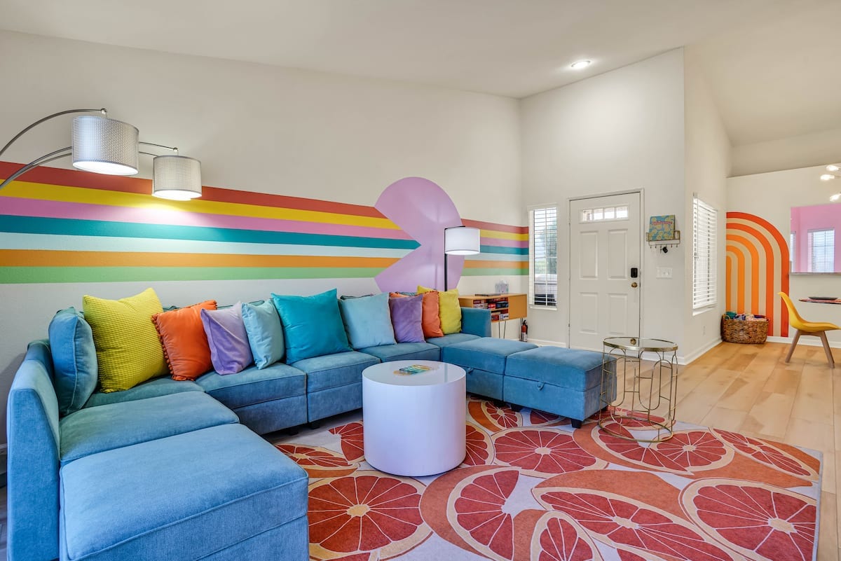 Our colorful, desert themed 2br/2ba lower unit condo is bright, spacious, & furnished with everything needed for a relaxing vacation. Great Wi-Fi for Zoom calls if needed! One of the many community pools/hot tubs sits steps away from the back patio, overlooking a beautiful greenbelt, palm tree lined sky, and peekaboo mountain range views with stunning sunsets. This is a no pet property. We also have a pack n play & high chair in unit for use.