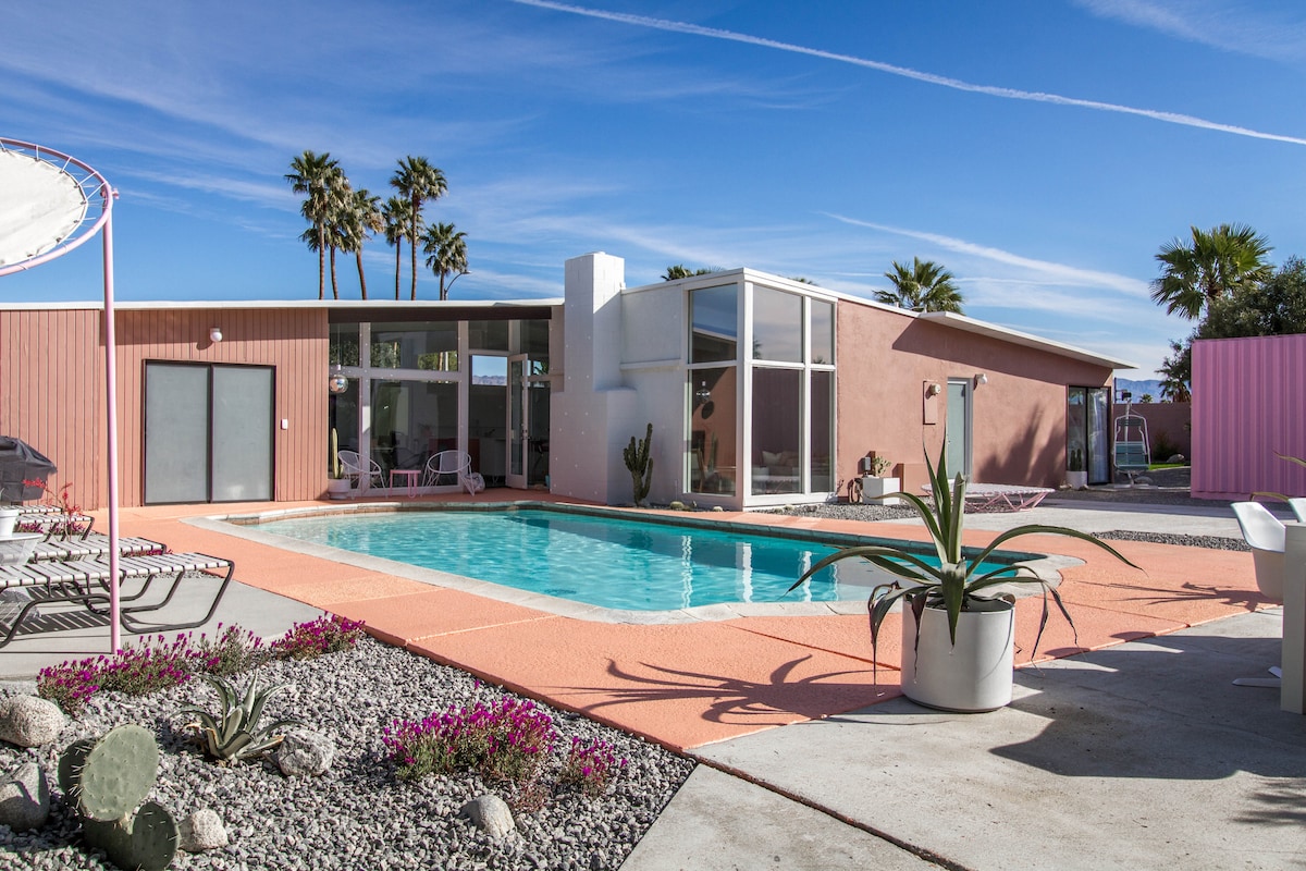 This defines Palm Springs--we invite you to relax! You have your own space, the full backyard, a 16'x32' pool with floats, plus hot tub-just add the cocktail or iced tea. High-ceiling casita apartment attached to a mid-century home assures privacy with its own secured gated entrance. The casita is 330 sq. ft. with mountain views out 8' sliders. It has two FULL beds [push together ;)], plus kitchen with a counter toaster/oven and an air fryer. The bath has a walk-in shower. (City ID #3881).