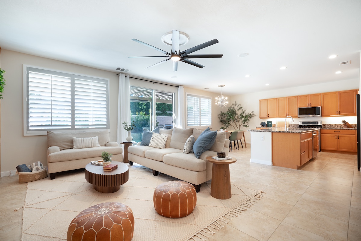 Welcome to @TheFunkyPalm! NEW 16 x 16 BASKETBALL COURT, Green & Arcade GAME ROOM w/full size BILLIARDS, ping pong, air hockey, skeeball, fusball, guitars, piano + Come play! Enjoy Poolside sunsets & let our HOTTUB soothe you. Early checkin/late checkout ok when we can. Get inspired by our posh design & Central location: -5min to La Quinta Sbucks, grocery stores, dining+ -5min to downtown Indio -15min to FantasySprings Casino -Min to golf courses/PGA West -15min to Arena -30min to PALM SPRINGS