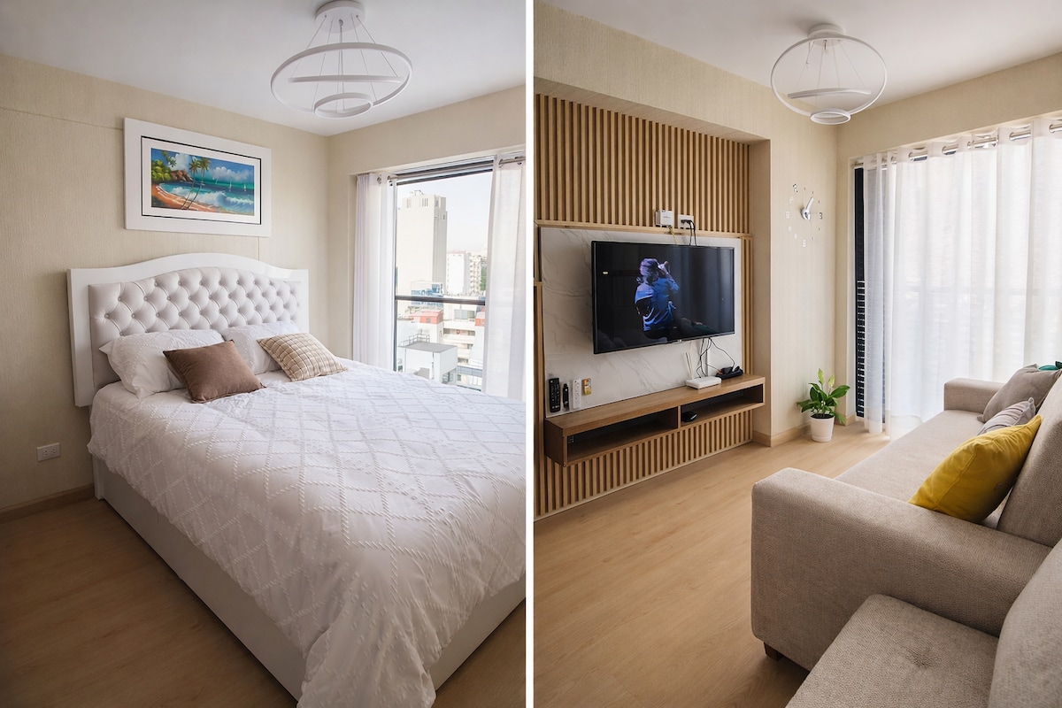 Departamento de estreno totalmente equipado con lo necesario para estadías cortas o largas, a 3 cuadras del Circuito Mágico de las aguas, a 2 cuadras de la Av. Arequipa, y a minutos del hospital Rebagliati. Cuenta con: ✔️ Sala con TV 55 pulgadas ✔️ Netflix y Disney. ✔️ 2 Hab. con Cama Queen ✔️ Cocina totalmente equipada ✔️ Baño con Ducha Española - Agua Caliente 🚘 Estacionamiento: S/ 20.00 (consultar disponibilidad) Máximo 4 personas, NO ESTÁ PERMITIDO EL INGRESO DE VISITAS