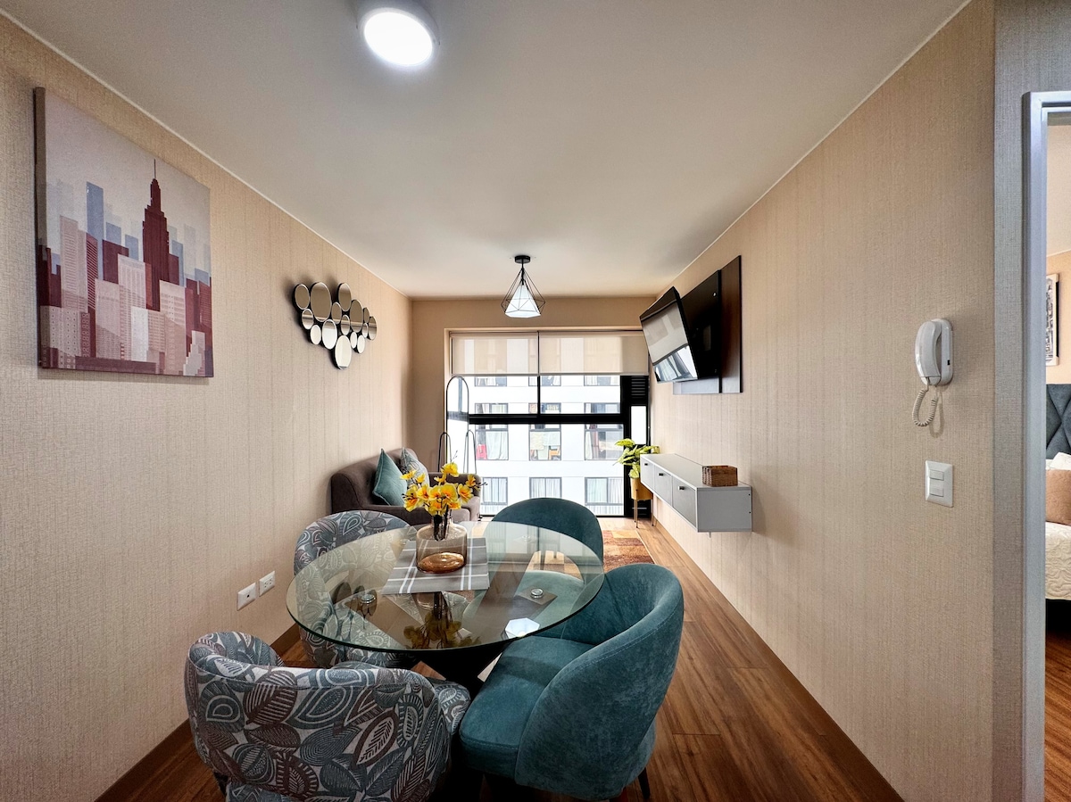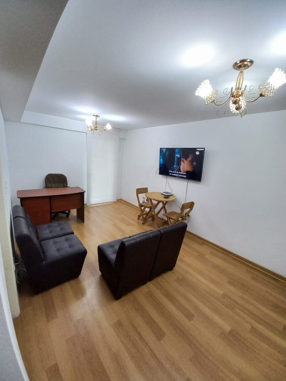 Departamento completo, cocina equipada, TV en la sala y dormitorio, ubicado en zona céntrica de Lima, fácil acceso para Centro histórico, Miraflores, Barranco, Aeropuerto, a una cuadra de principales avenidas, Arequipa, Arenales, Salaverry, cerca al Parque de las Aguas, al Estadio Nacional, Hospitales, Universidades, Ministerios, acceso con código , recepcion 24x 7, Cafeterías, Tiendas OXXO, MASS, Restaurantes. Brindamos un par de toallas grandes y chicas