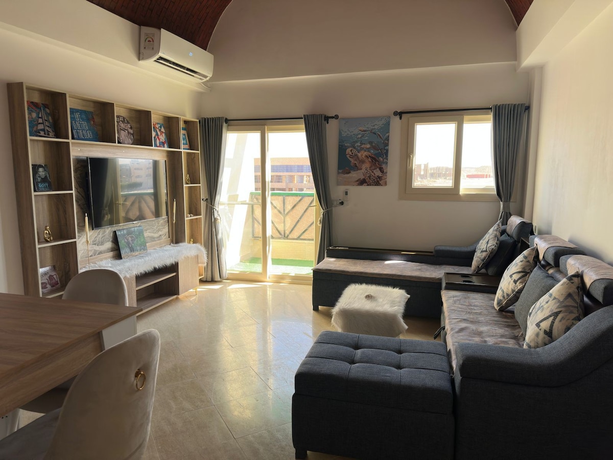 Escape to Comfort in Marsa Alam! Welcome to our cozy and well-equipped apartment, perfect for a relaxing stay by the Red Sea. The features: - A comfortable living room to unwind after a day of adventure. - A bedroom with two beds, ideal for friends or family. - A fully equipped kitchen with everything you need to prepare meals. - A clean and modern bathroom for your convenience. Located in a peaceful area, it's perfect for divers, beach lovers. Book your stay now and enjoy Marsa Alam!