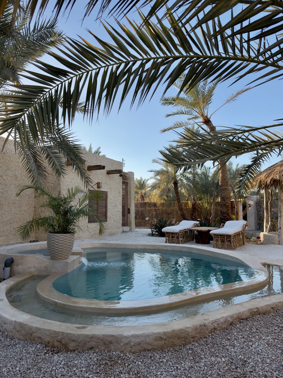 Looking for a serene retreat in Siwa? Welcome to your hidden desert gem nestled among palm trees. Warm desert days and cool nights are perfectly balanced here with a custom designed Siwan shaped pool for daytime dips and a cozy fire pit for evenings. You can enjoy stargazing and a view of the date palm forest from our spacious roof deck. For a unique culinary experience, our house chef can prepare and deliver delicious Siwan food right to your door. Embrace nature and unwind with us!