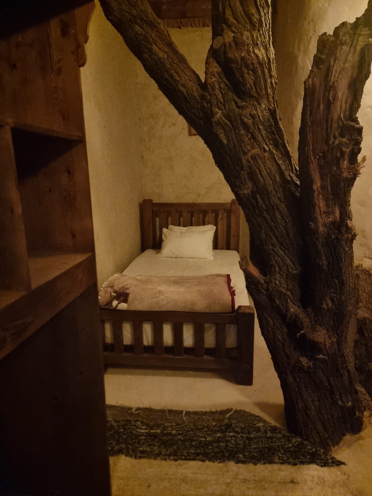 Hidden among palm trees in the heart of Siwa Oasis, this private villa offers a peaceful retreat away from the bustle. Just a 10-minute walk (3 minutes by car) from the lively Siwa market, it balances serenity with convenience. Built as an earth home using traditional mud and natural wood, the space reflects Siwa’s spirit. Handcrafted olive-wood furnishings, warm salt lamps, and natural textures create a grounding atmosphere designed for rest, renewal, and reconnection.