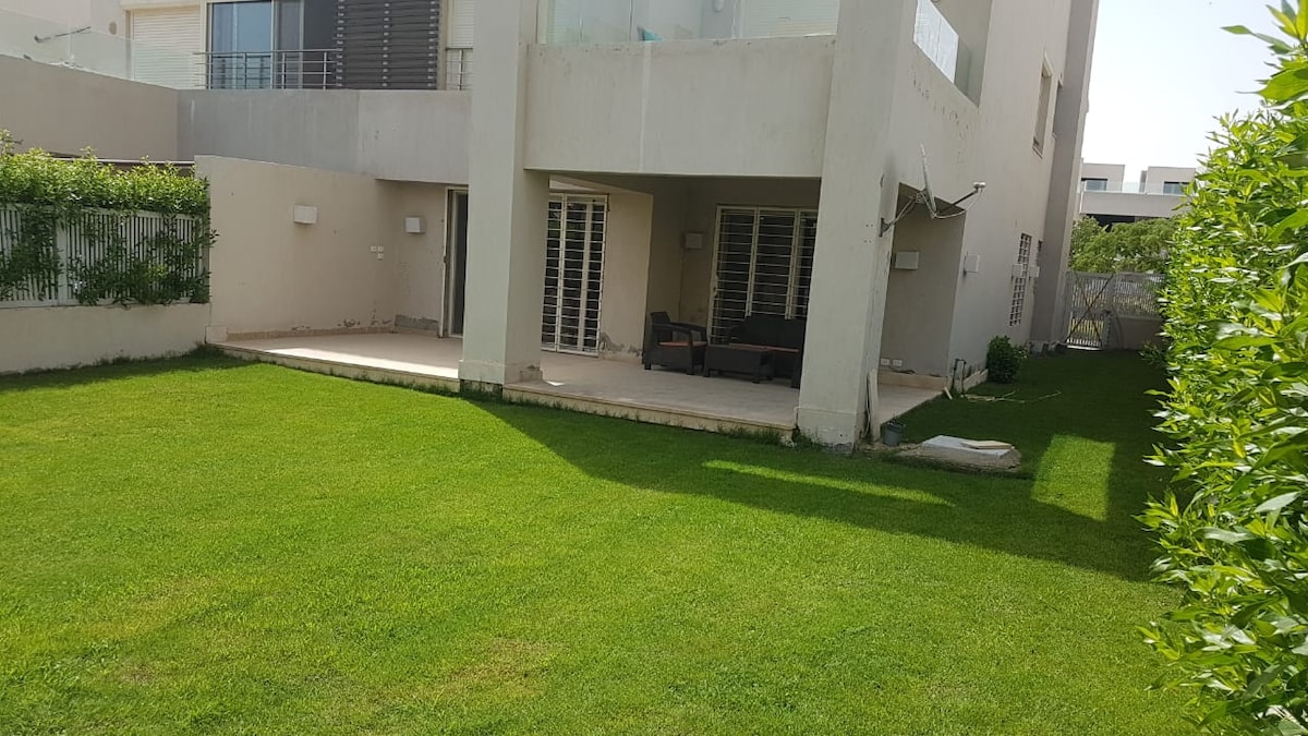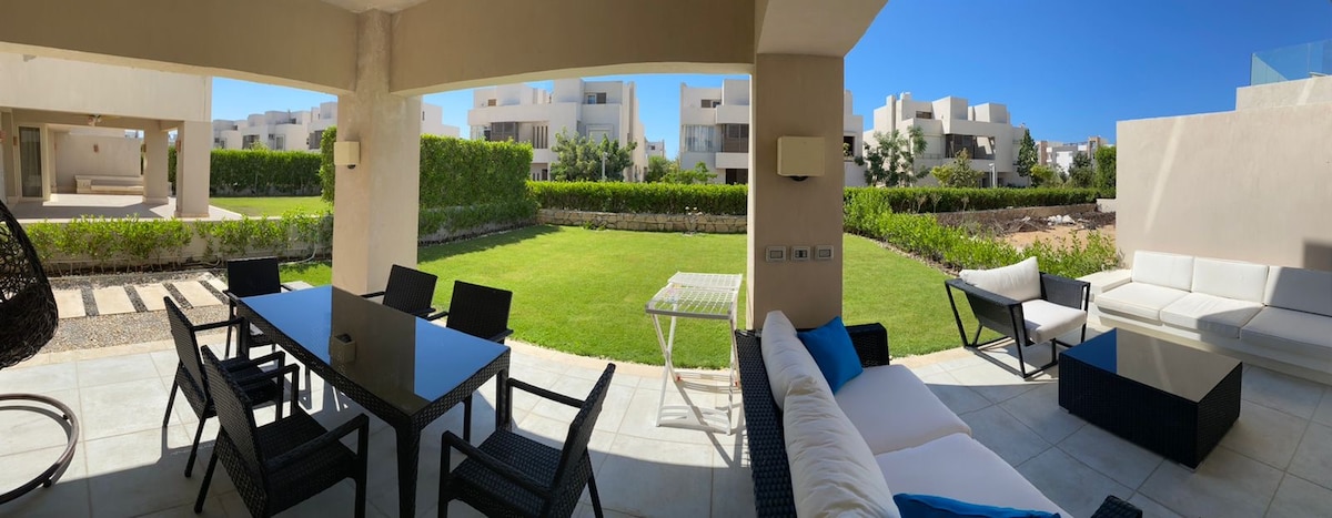 - Fully furnished ground floor chalet with garden at Hacienda Bay, North Coast. - 2 master bedrooms. - Fully equipped American kitchen. - 6 places dining table. - Three bathrooms with showers. - Big reception with three sofa beds. - 170 m2 garden. All bedrooms are air conditioned. - The chalet is walking distance from a swimming pool. 3 minutes driving from the beach.