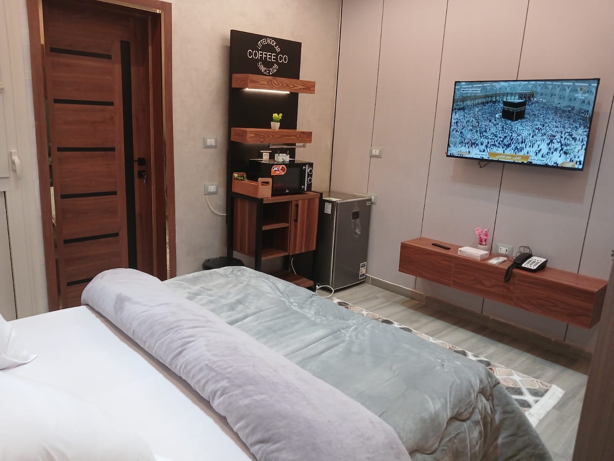 غرفة 7 غرفة فندقية ذات تشطيب عصري راقى ، الغرفة مجهزة بالكامل بكافة الخدمات ، مكون من .. سرير كبير و ادوات كهربائية و حمام و مطبخ و حراسة للفندق 24 ساعة و يوجد واي فاي و استراحة خارج الفندق لتناول الطعام و المشروبات