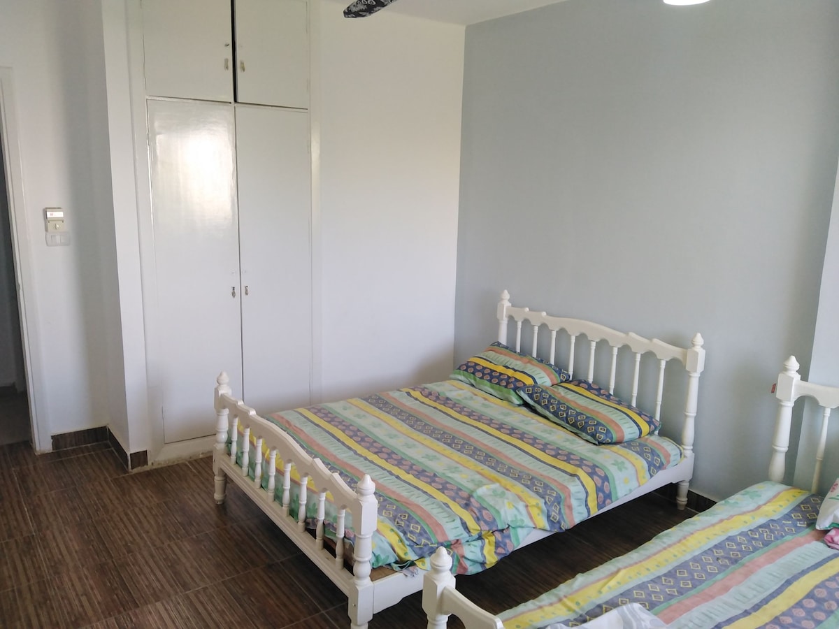 A beautiful place with a lot of space and an amazing view day and night to the sea and to Farouk Gardens. There is concierge 💁♂️ available 24/7. The building is located next to Royal Plaza Mall. Right next to the building is a Carrefour and some cafes and restaurants. You can also find a pharmacy at the ground floor. Is 2 minutes walk from Montaza Palace and 5 minutes walk from Mamurah beach. 1 king size bedroom with private bathroom 1 bedroom with 2 single beds 1 bedroom with 2 single beds