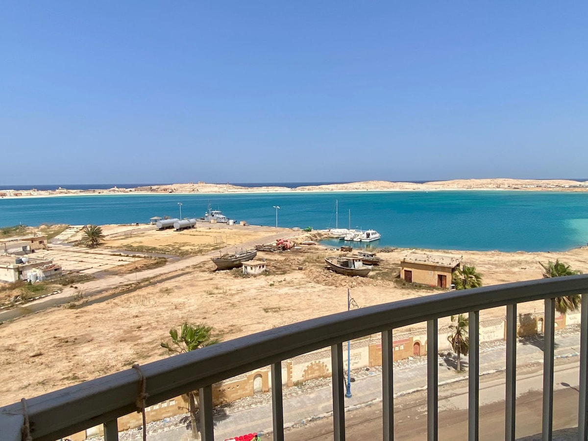 Fully furnished family apartment with direct views over Marsa Matrouh's harbour and beaches. Steps from downtown, markets, and restaurants. Two air-conditioned bedrooms — double bed and two single beds. Living room with sofas and TV. Dining area. Equipped kitchen with fridge, stove, and microwave. Clean bathroom. Peaceful sea-view balcony. Families only. Quiet and safe environment. Not suitable for parties.
