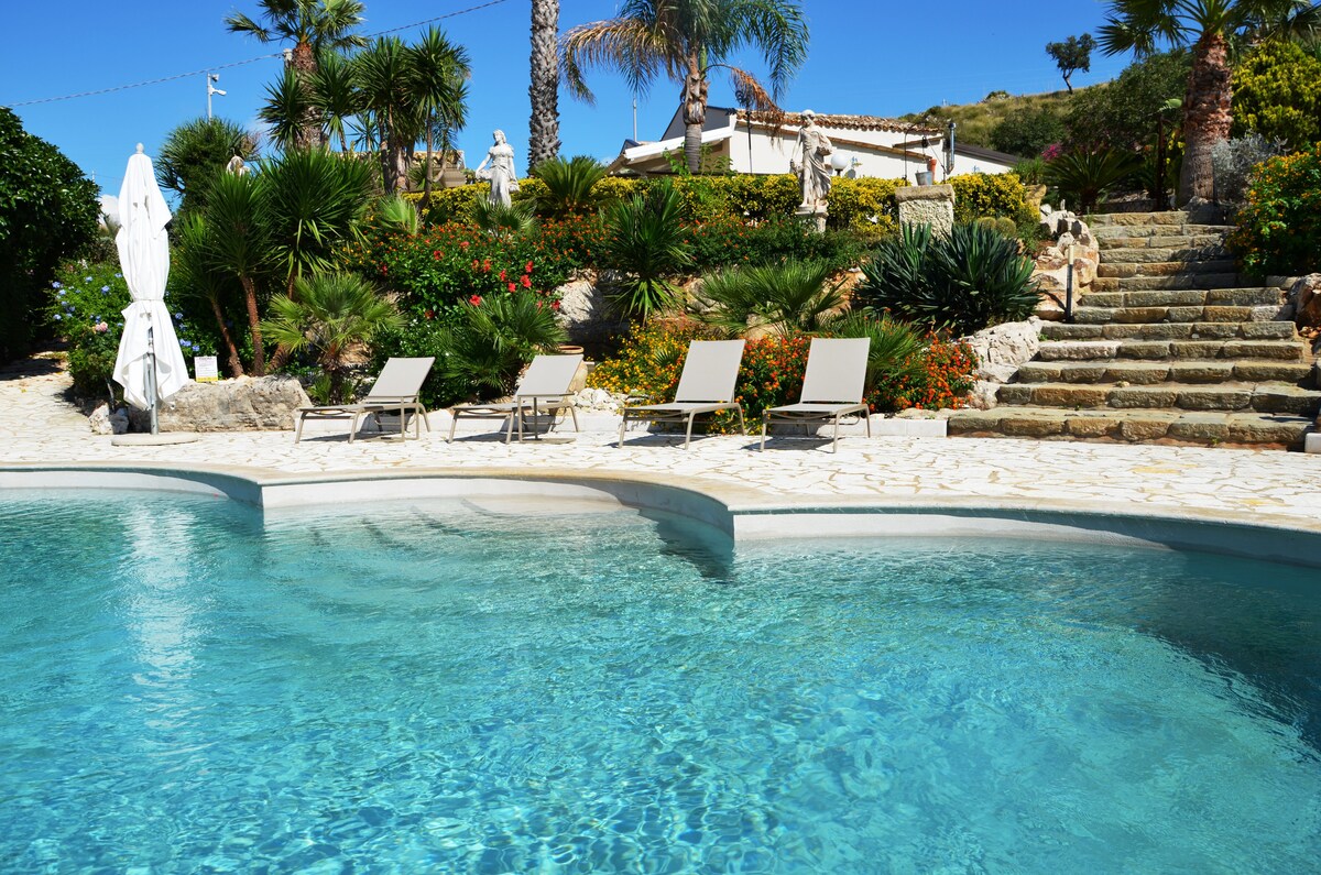 CHARME AUTENTICO SICILIANO, con panorama mozzafiato! Villa nobiliare Italiana del primi del ‘900 in style Liberty, arredata con mobili d’epoca, circondata da prati inglesi, bosco secolare e alberi di agrumi. La raffinata ed elegante piscina con idromassaggio, la vasca Jacuzzi riscaldata tutto l'anno, sono ad uso esclusivo degli ospiti, che godono di una privacy assoluta. Spettacolare il grande terrazzo con una vista magnifica sulla piscina e Golfo di Castellammare.