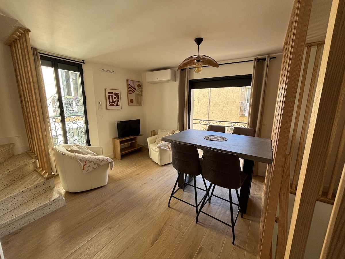 Maison de 45 m2 sur 2niveaux entièrement rénovée avec prestations de qualité au cœur du village dans quartier calme à 2mn à pieds des commerces,restaurants…et 5mn du port. Rdc : canapé 3 places /espace wc 1er étage : salon salle à manger /cuisine entièrement équipée Terrasse exposition sud est avec salon 2eme étage : Chambre: lit en 140x190(literie epeda),commode / dressing séparé / salle de bains: douche italienne et wc Stationnement gratuit à proximité.
