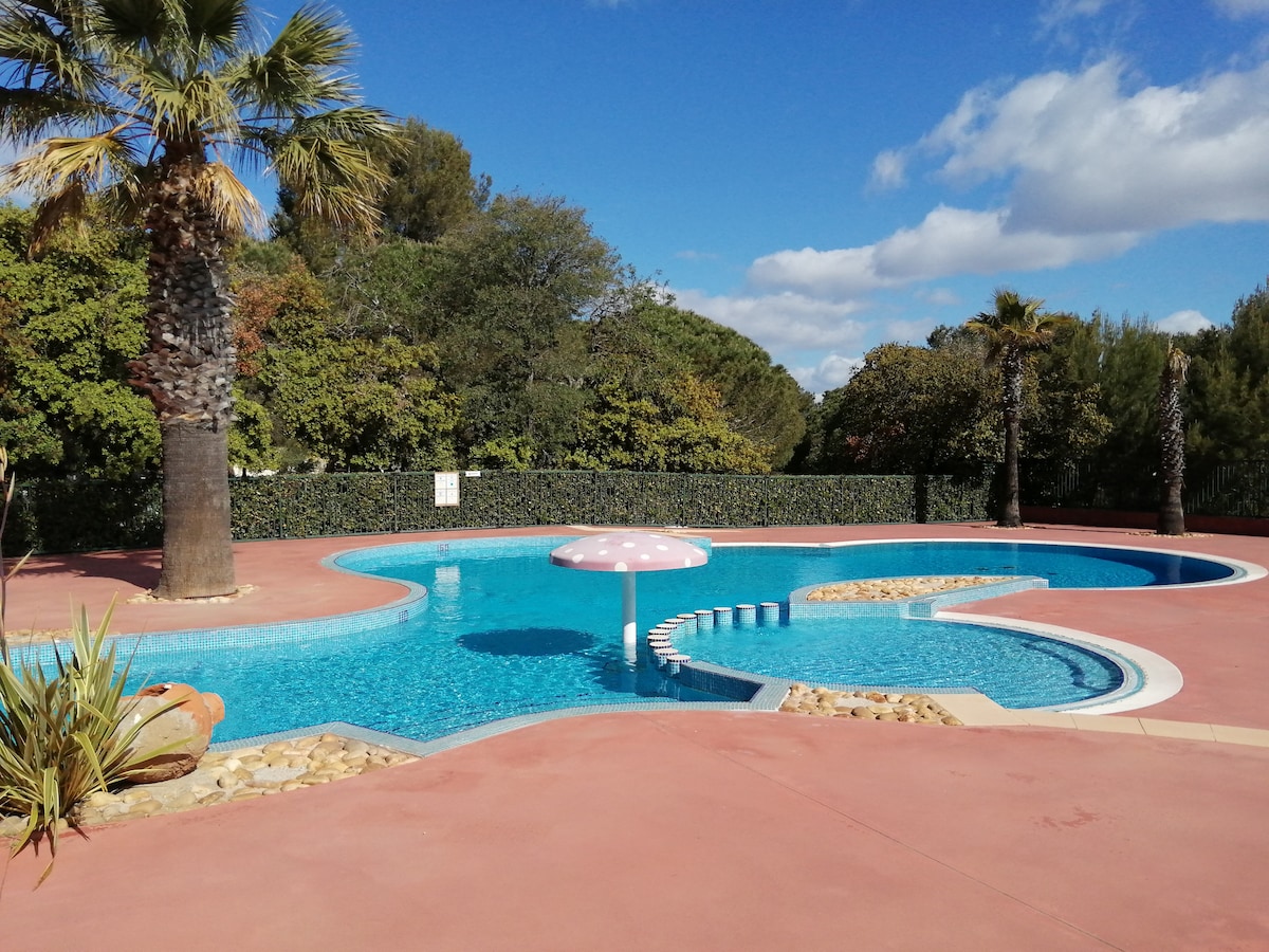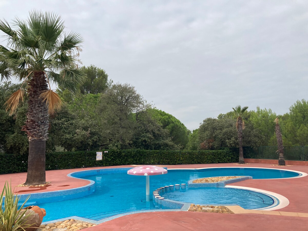 Mobil-home sous les pins Camping 4* Lac des Rêves 40m2 Literie parentale 160cm + matelas latex Piscine chauffée et animations TOUTE la saison (pataugeoire, toboggan, jaccuzi ...(achat en sus "FUNPASS" auprès du camping") Emplacement au calme à 5min à pied de la fun zone. Palmeraie vue sur le lac Accès vélo mer Montpellier à 7km Ping-pong, terrain tennis, basket, foot, mini-golf, pétanque, fitness, accro-game, trampoline, pumptrack, aires de jeux Activités d’aqua fitness, tir à l'arc Club enfants