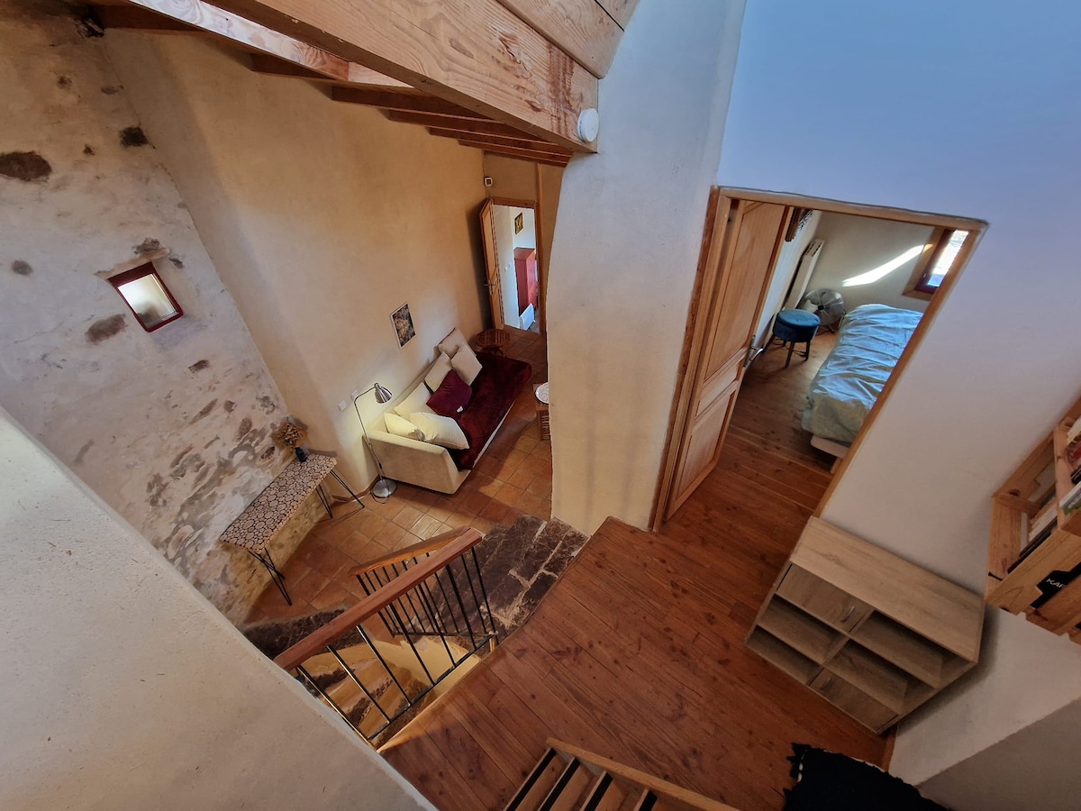 A 2km du lac du Salagou, au centre du petit hameau le Mas Audran, maison en pierres de pays récemment rénovée. Hameau paisible sans voiture en flanc de montagne protégé du vent du nord d'ou son micro climat au milieu des agaves et orangers, vous pourrez partir au lac à pieds en 15 min par la route ou bien par un sentier pour rejoindre la côte sauvage du Lac du Salagou. La ruffe, (sable rouge) paysages typique du Salagou vous émerveillera en toutes saisons.