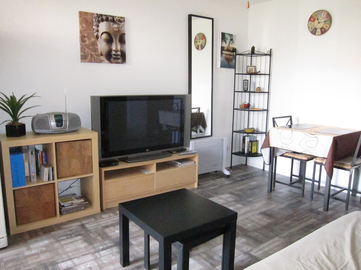 Appartement refait à neuf Ce logement se situe à 2 min du centre du port du Cap d’Agde et de ses rues commerçantes piétonnes. Tout est faisable à pied ( plage, île des loisirs, casino, port…) Place de parking privative et sécurisée par caméra de surveillance et portail. Chambre lit 140x190, canapé cuir transformable en vrai lit 140x200. Cuisine équipée Pas de WIFI, Pas de CLIM NB : Nous ne fournissons plus les draps/ serviettes uniquement location Lit bébé et chaise haute sur demande