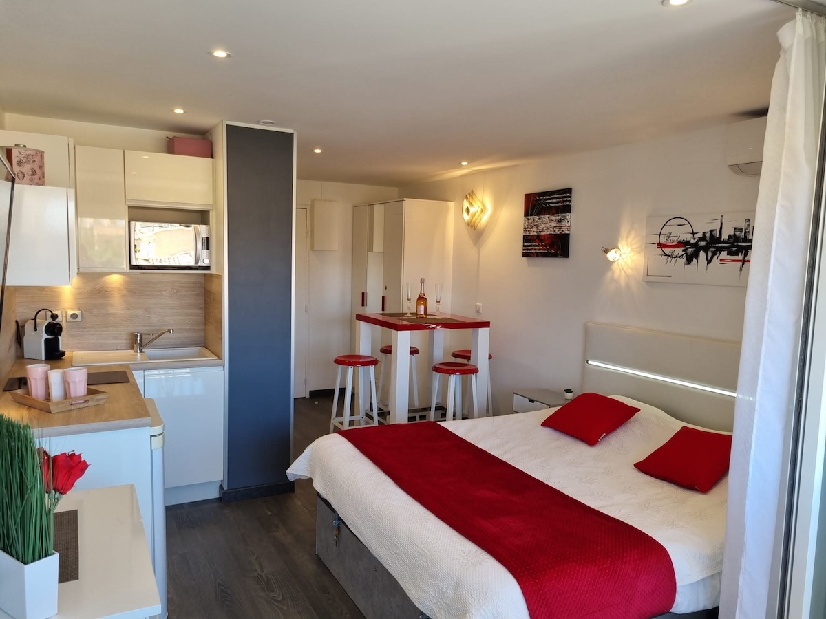 Apartment 5 people (separate sleeping for children) Close to all amenities, everything is on foot: Beaches (conch, plagette, mole) Access center port (shops, entertainment, restaurant) Air conditioning - Internet - wifi (box) - Secure parking Pool with loungers (two pools - one for the little ones) The apartment is fully equipped (large fridge-freezer, dishwasher, washing machine, connected TV, sofa. Open terrace overlooking the boats (umbrella, outdoor table and chairs)