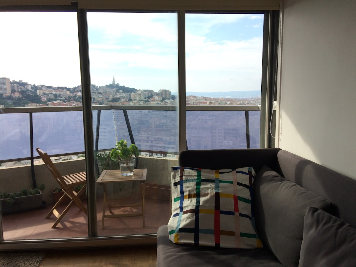 T2 de 45m2, Quatrième étage sans ascenseur. Grande terrasse et vue sur Notre Dame de la Garde, lumineux, cuisine équipée, salon, 1 chambre, salle de bains / douche, WC. Proche Cours Julien et Vieux Port, restaurants, transports. Gare Saint Charles à 15 min à pied (ou métro Notre Dame du Mont) Cosy flat with amazing view, fourth floor (no lift). Central Marseille, near Cours Julien and Vieux Port. Saint Charles railway station, 15 min walking (or metro Notre Dame du Mont)